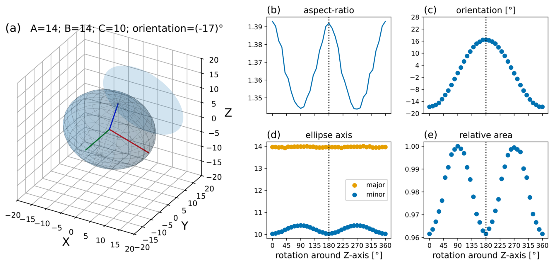 Figure C3Panel (a) shows an ellipsoid together with its projection to the XZ plane, which corresponds to the image plane of the microphotograph (cf. Fig. 1). A = 14 (red), B = 14 (green), and C = 10 (blue) are the ellipsoids' axes, and the orientation is the angle (−17°) between the semi-major axis (a) and the X axis. Panels (b–e) show the evolution of the aspect ratio, the orientation, the major and minor axis, and the relative area with progressing rotation around the Z axis (core axis) from 0°, initial condition in panel (a), to 360°.