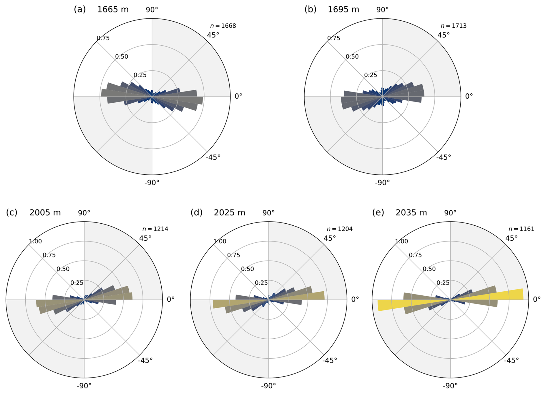 The median of the distribution of absolute air hydrate orientations () is shown in Fig. 8b. The average orientation from 1255 to 2005 m is 19°, with a small increase of ca. 5° at around 1695 m. Similarly to the air hydrates' median AR, we observe an abrupt decrease in of about 10° between 2005–2035 m depth, i.e., a rotation towards the horizontal. From 2035 m, slowly decreases to a minimum of 7° at 2395 m. Between 2395–2405 m, suddenly doubles (14°), and, from 2405 m to the bottom, it slowly decreases to about 10°. Overall, decreases with increasing depth.