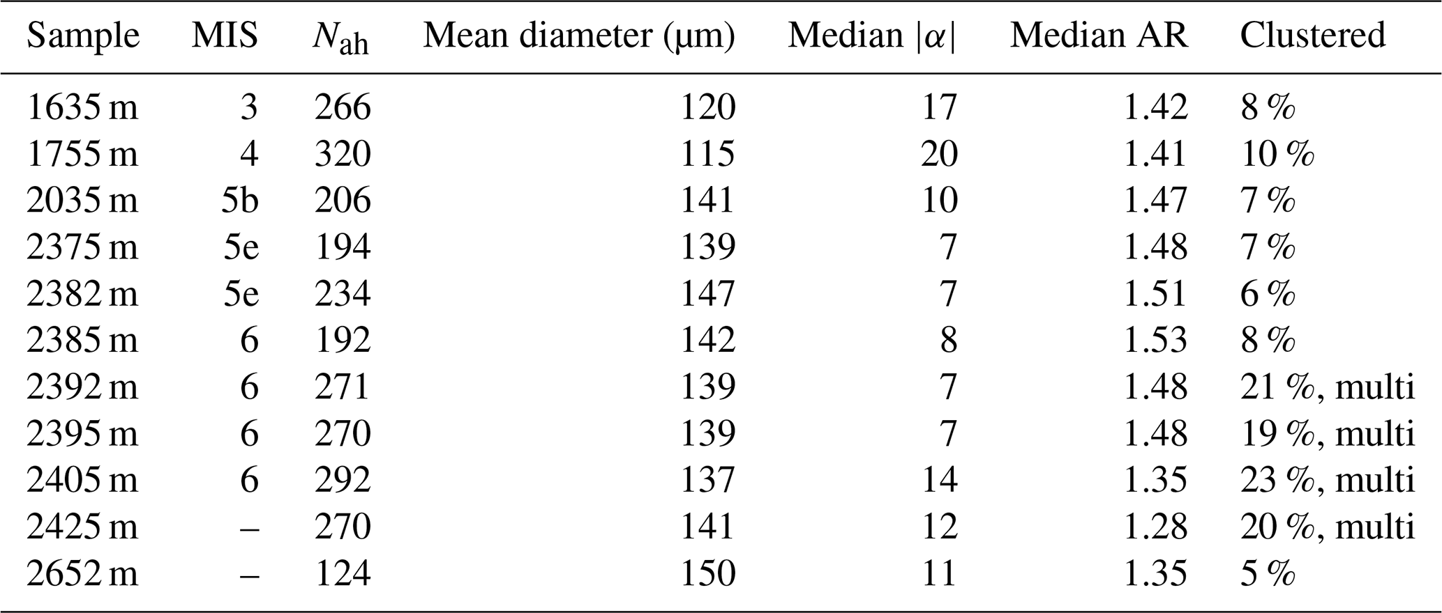 Table 3Air hydrate parameters for selected samples from MIS 3–5 and from the penultimate glacial–interglacial transition zone. We used randomly selected air hydrates belonging to the “in focus” visual category (A, C in Fig. 1) to determine the number of clustered air hydrates. The number of randomly selected air hydrates is equal to the samples' Nah.