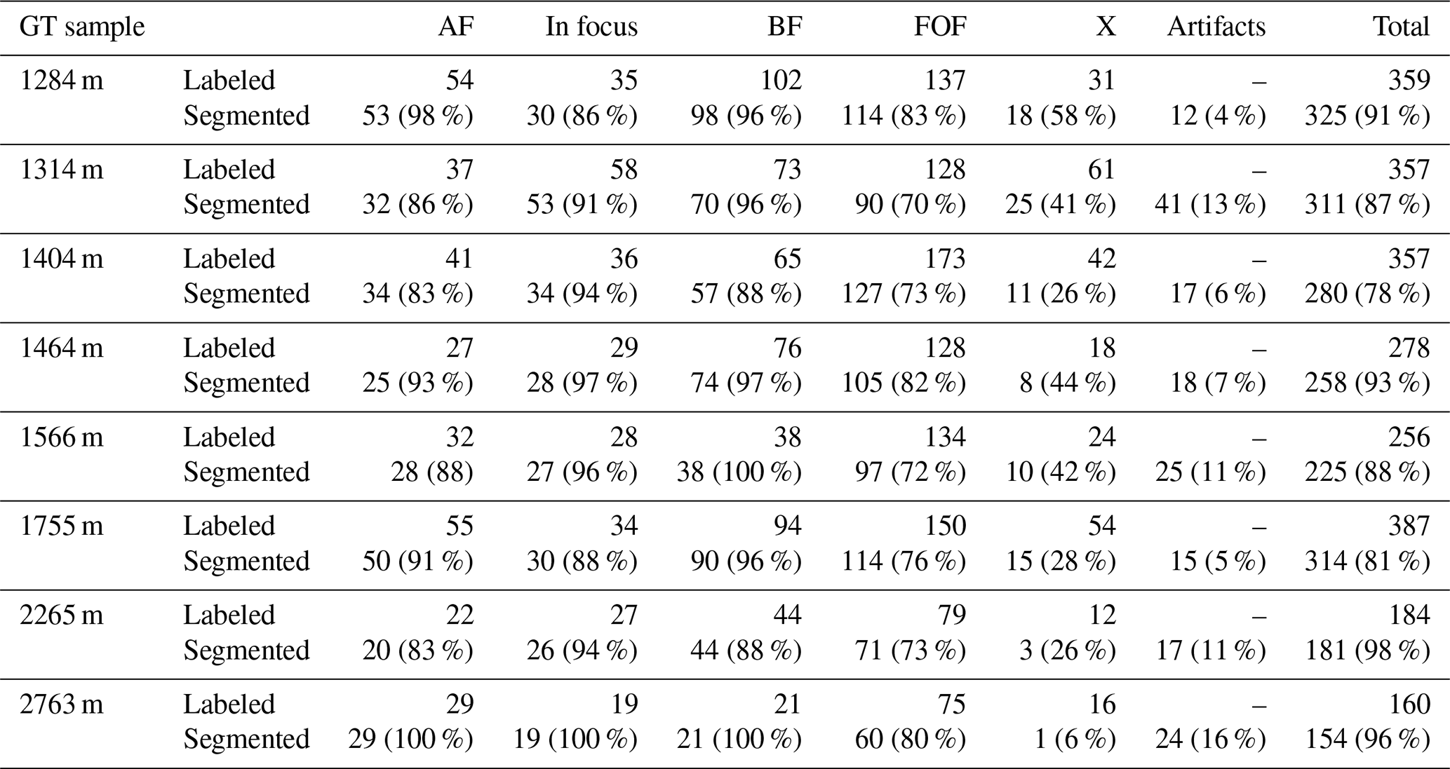 To evaluate the segmentation routine, we created eight ground truth (GT) images with dimensions of 20 mm×10 mm. They were selected to represent the six image categories and to reflect the diversity of the dataset (Fig. A1). Each GT image contains 160–387 air hydrates which were traced by hand and classified into five visual categories using the ImageJ/Fiji plugin LABKIT (Arzt et al., 2022). Emphasis was placed on labeling an image in one run and the individual images in quick succession in order to keep human bias as low as possible. The labeling criteria, an example distribution, and a segmentation performance of each visual category can be seen in Table 1. Note that, although the output of the segmentation routine produces a binary image (two classes: air hydrates and background), the introduction of the five hydrate categories in the GT image is useful for a deeper understanding of the performance of each routine and the raw image data.