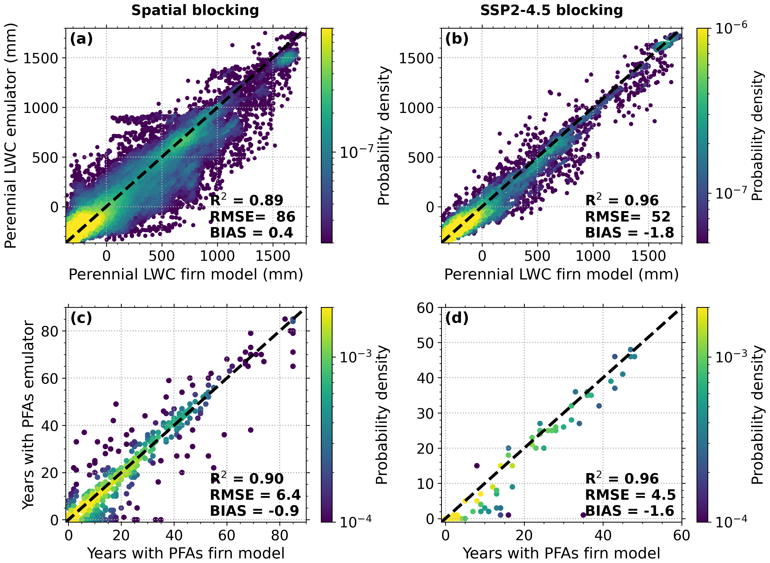 Figure 2(a, b) Perennial liquid water content (LWC) and (c, d) number of years with perennial firn aquifers (PFAs) from the (a, b) spatial blocking cross-validation and (c, d) SSP2-4.5 block validation. Panels (a) and (b) include the data points used for training and evaluation described in Sect. 2.2.2. Panels (c) and (d) include all locations where either the emulator or the model forecasts the presence of an aquifer or predicts fewer than 150 d without LWC in at least one year in the associated scenario.