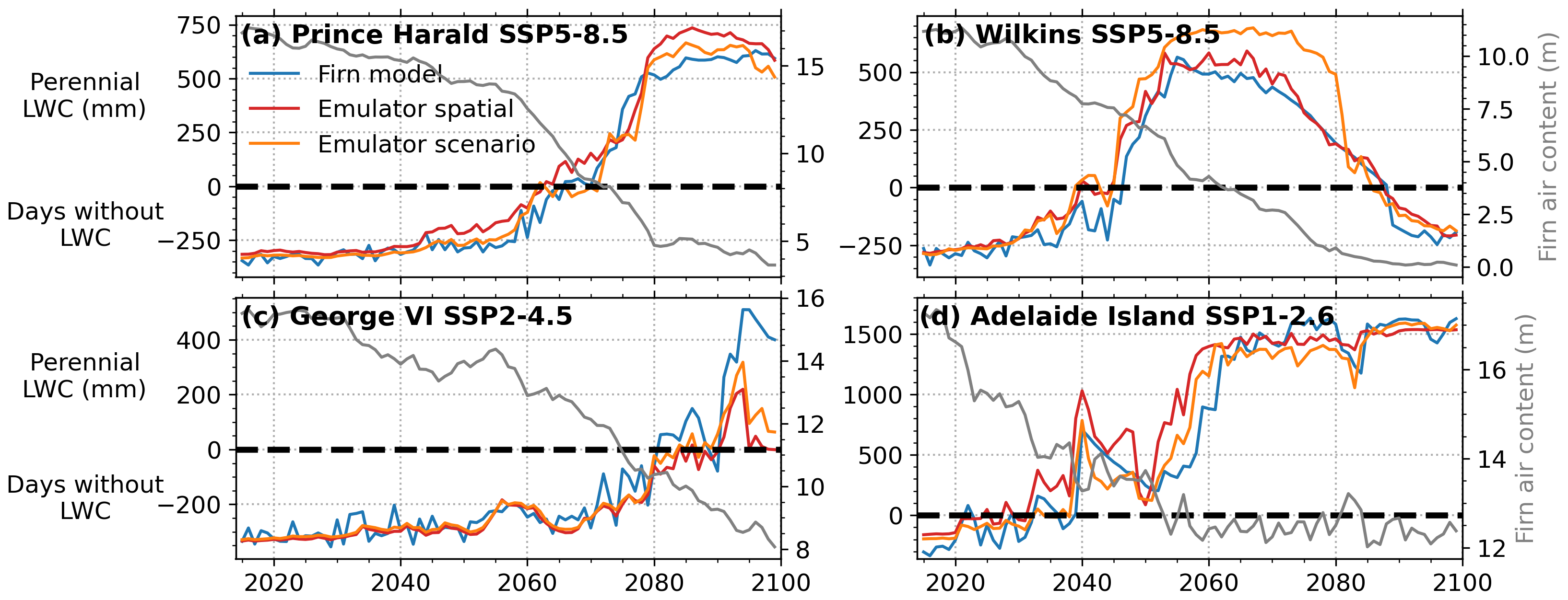 Figure 4Example time series of perennial liquid water content (LWC)/days without LWC for the firn model (blue) and the emulator, for spatial blocking (red) and for scenario blocking (orange), as well as firn air content for the firn model (grey), for individual grid points and different scenarios: (a, b) SSP5-8.5, (c) SSP2-4.5, (d) SSP1.2-6. The locations of the grid points are indicated in Fig. 1.