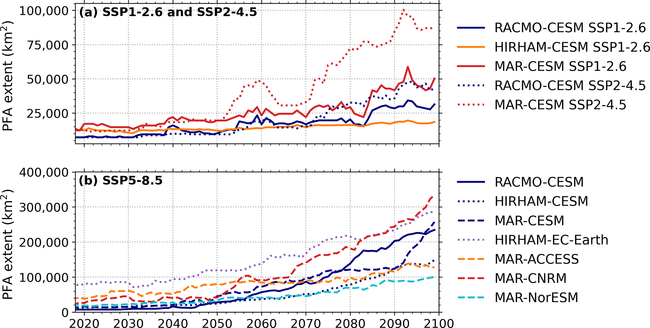 Figure S4 shows the locations of these transient PFAs for the RACMO and MAR (SSP5-8.5) driven emulator simulations. Transient PFAs mainly occur along the boundaries of PFA regions. Most notably, transient PFAs occur on Wilkins Ice Shelf for RACMO-CESM for the SSP5-8.5 scenarios. Transient PFAs mainly occur under SSP5-8.5, covering on average 28 000 km2 by 2100, which is 13 % compared with the 2100 PFA extent (Fig. 11). In the SSP1-2.6 and SSP2-4.5 scenarios, the extent of transient PFAs is, on average, only 4200 km2, 9 % of the 2100 PFA extent.