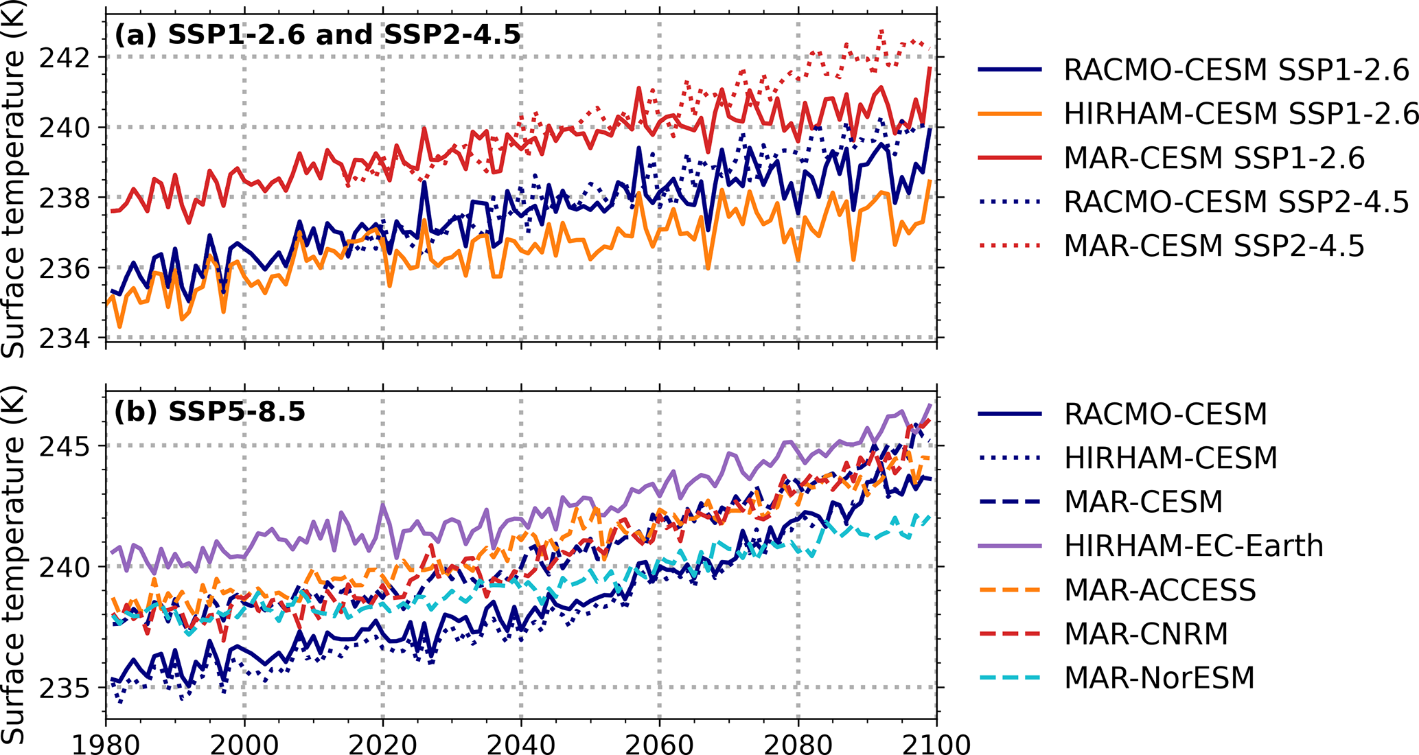 Even for the contemporary AIS climate, significant differences in near-surface air temperature, snowfall and melt exist between these three RCMs (Mottram et al., 2021; Carter et al., 2022). An important difference between the RCMs lies in the handling of precipitation advection: MAR allows precipitation to be advected through the atmospheric layers until the surface is reached, whereas RACMO and HIRHAM deposit precipitation instantaneously. Furthermore, RACMO and MAR use subsurface schemes optimized over snow and ice for Antarctica, while HIRHAM applies simpler surface snow physics for ice surfaces. In addition, notable climatic differences between the GCM simulations exists; for instance, the 21st century AIS warming for the four selected GCMs for MAR for SSP5-8.5 ranges from +3.2 K (NorESM1-M) to +8.5 K (CNRM-CM6-1; Kittel et al., 2021).