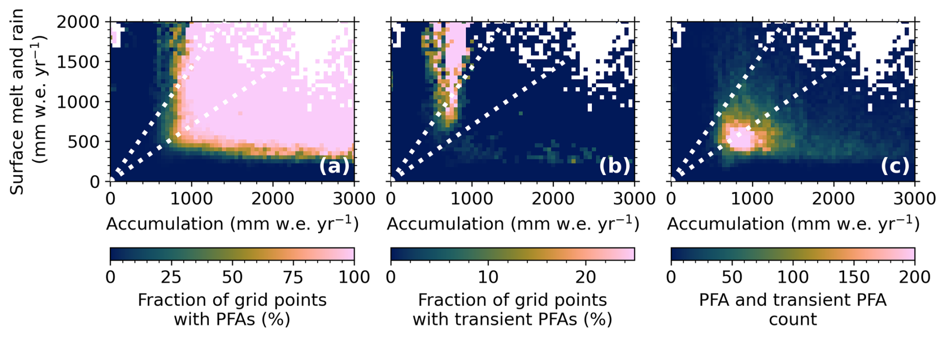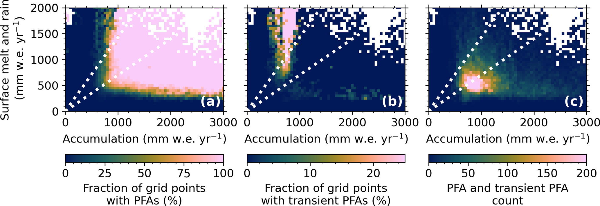 As Fig. 4b shows, PFAs can also develop, shrink and subsequently disappear and henceforth will be referred to as transient PFAs. This shrinkage and disappearance occurs when the firn layer becomes too thin (i.e. the firn air is too depleted) to host an aquifer. A transient PFA is defined as a PFA that existed for at least 5 years but will have disappeared before the year 2100. Figure 11b shows the presence of transient PFAs simulated with the emulator, as a function of melt (plus rain) against accumulation rates for RACMO and MAR simulations. The white dotted lines indicate the melt-over-accumulation (MoA) ratios of 0.7 and 1.7, which are theoretical thresholds for indicating ice slabs and ablation zone, respectively (Brils et al., 2024). Transient PFAs mainly occur once the 0.7 and, especially, the 1.7 thresholds have been exceeded and mainly below accumulation rates of 1000 .