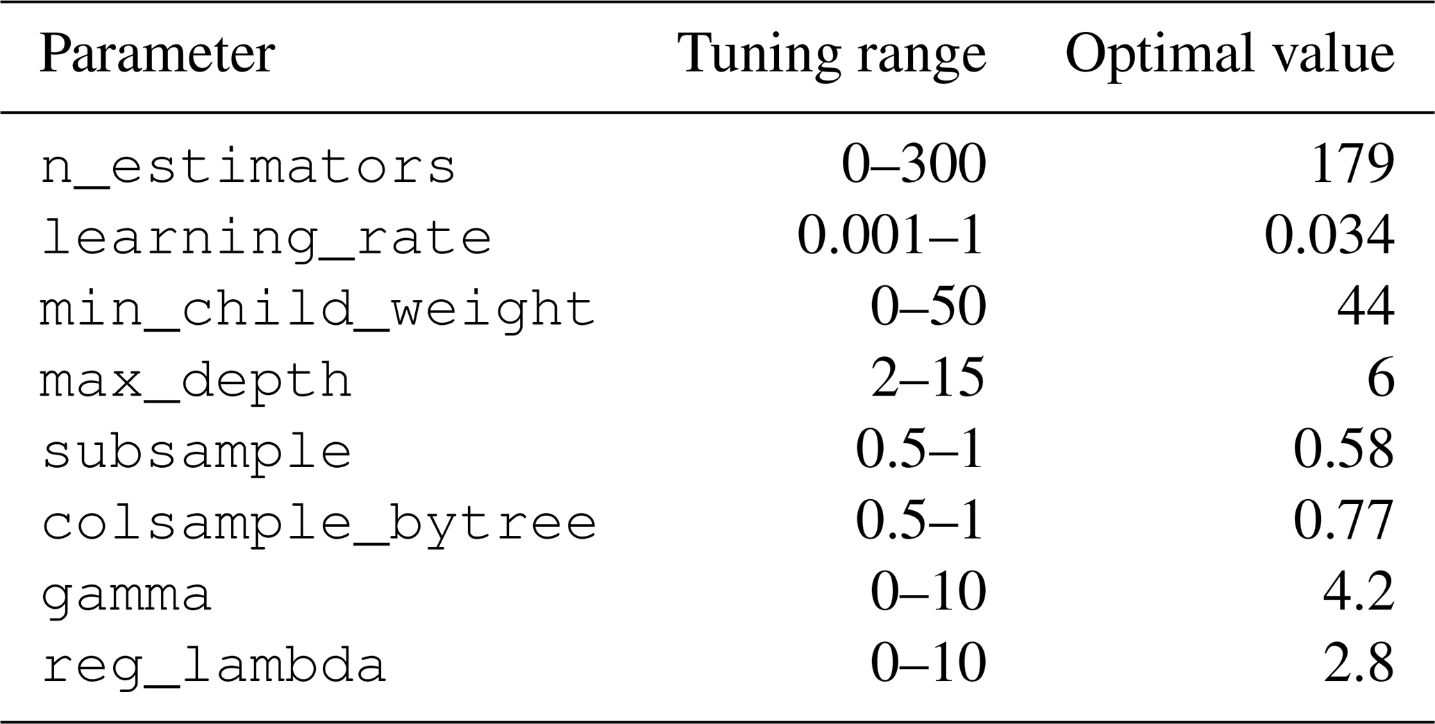 The hyperparameters are tuned using the BayesSearchCV function (built-in in scikit-learn) during the spatial blocking cross-validation. Eight key hyperparameters involved in the XGBoost algorithm were optimized. Firstly, the number of estimators (n_estimators) refers to the number of trees. The learning rate (learning_rate) controls the step size at which the optimizer makes updates to the weights. The regularization techniques included in XGBoost are the maximum depth of the trees (max_depth), the minimum weight needed in a leaf node (min_child_weight), the subsample ratio of the training instances (subsample), the subsample ratio of columns when constructing each tree (colsample_bytree), the minimum loss reduction (gamma) and the regularization degree (reg_lambda).