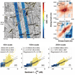 For comparison, the collocation between the merged Fs map and the SAR image on the same day (details in Table B1) shows statistically significant but lower correlation coefficients (Fig. 2b). The decorrelation length is much longer than that for 1 m-scale Fs (i.e., Fig. S2), mainly due to that correlation between Fs and σ0 is carried out at the scale of 40 m. Besides, the statistical relationship between and σ0 in the HV-polarization channel is also significant (details in Appendix C).