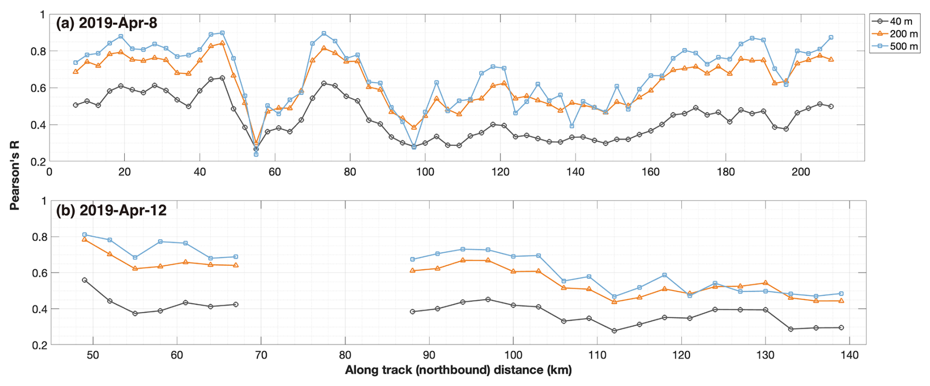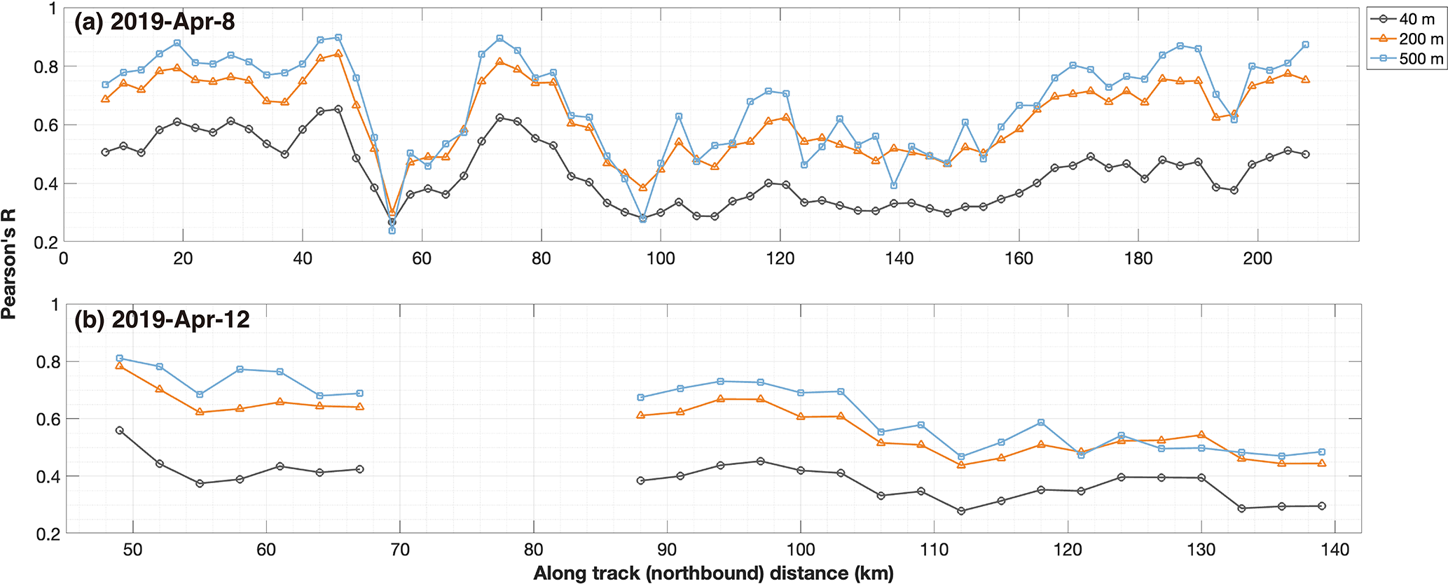 Figure 11The statistical correlation between Fs and σ0 at three spatial scales: 40, 200, and 500 m. The coarsening is applied to both Fs and σ0 at these scales. The results for the OIB track on 8 and 12 April are shown in panel (a) and (b), respectively. In order to accumulate enough samples, especially at the 500 m scale, both the inbound and the outbound segments are used to compute the correlation coefficients. Note that in order to accommodate the effective resolution of σ0 maps, in Figs. 2 and 3, we only applied spatial averaging to Fs but not to σ0.