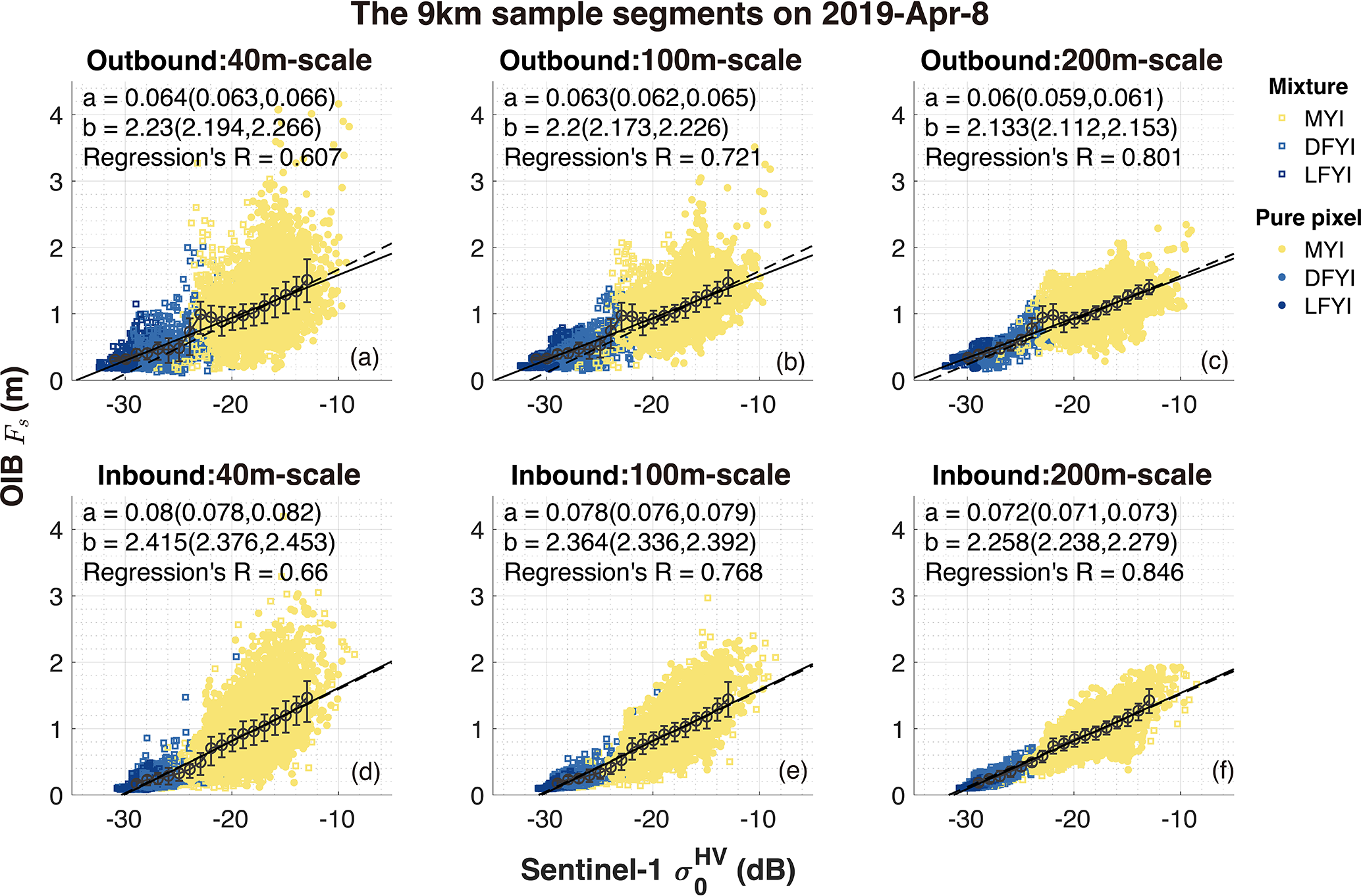 To analyze the statistical relationship between Fs and C-band backscatter, we employed a linear regression model for each 9 km segment (both outbound and inbound), defined as: . Sea ice type maps, which classify the sea ice into LFYI, DFYI, and MYI, were used. During the classification, a sliding window of 11 pixels was applied in the classification process; if all pixels within an 11×11 window were of the same type, the central pixel was classified as a pure pixel (indicated by solid circles in Figs. 2d–i and 3d–i); otherwise, it was labeled as a mixture(indicated by square symbols in Figs. 2d–i and 3d–i). We specifically examined the relationship between Fs and backscatter for pure MYI pixels. Due to the limited number of pure FYI and DFYI pixels, these were not included in further analysis.