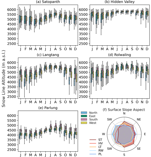 Catchment snowlines showed distinct seasonal patterns of aspect dependence (Fig. 5). A common characteristic among the five catchments was the minimal difference in SLA between aspects during the monsoon season, in contrast to the substantial SLA differences between aspects during winter. Additionally, the standard deviation in the SLA, represented by the error bars in Fig. 5, was smallest during the monsoon season, gradually increasing, and largest during winter. Regarding specific regional characteristics, Satopanth showed minimal differences in the SLA between aspects, even during winter, with only a slight decrease in the north-facing SLA. Conversely, aspect-induced differences were pronounced throughout the year in the Parlung region. Furthermore, Parlung exhibited a relatively small seasonal variability in the standard deviation of the SLA values.