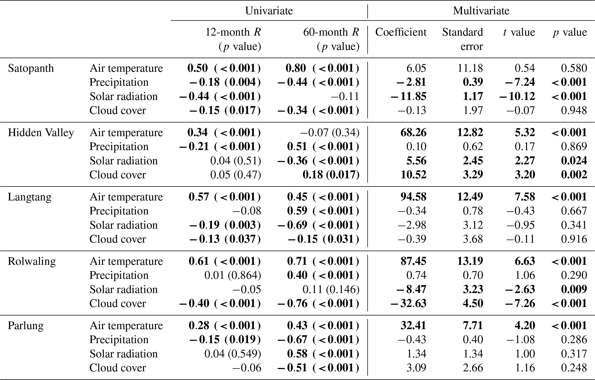 The 12-month moving averages of snowline altitude exhibited significant correlations with changes in air temperature across most sites, except for Satopanth (Fig. 7, Table 3). In Rolwaling, all climatic variables except precipitation demonstrated a correlation with the SLA, with air temperature exhibiting the strongest impact, as evidenced by the largest t value. Conversely, in Satopanth, precipitation emerged as the sole statistical control on SLA, with a negative t value indicating that precipitation lowers the SLA. This finding that increased precipitation at the decadal scale has lowered the SLA is consistent with the results of our seasonal analyses that increased winter snowfall lowers the winter SLA in Satopanth.