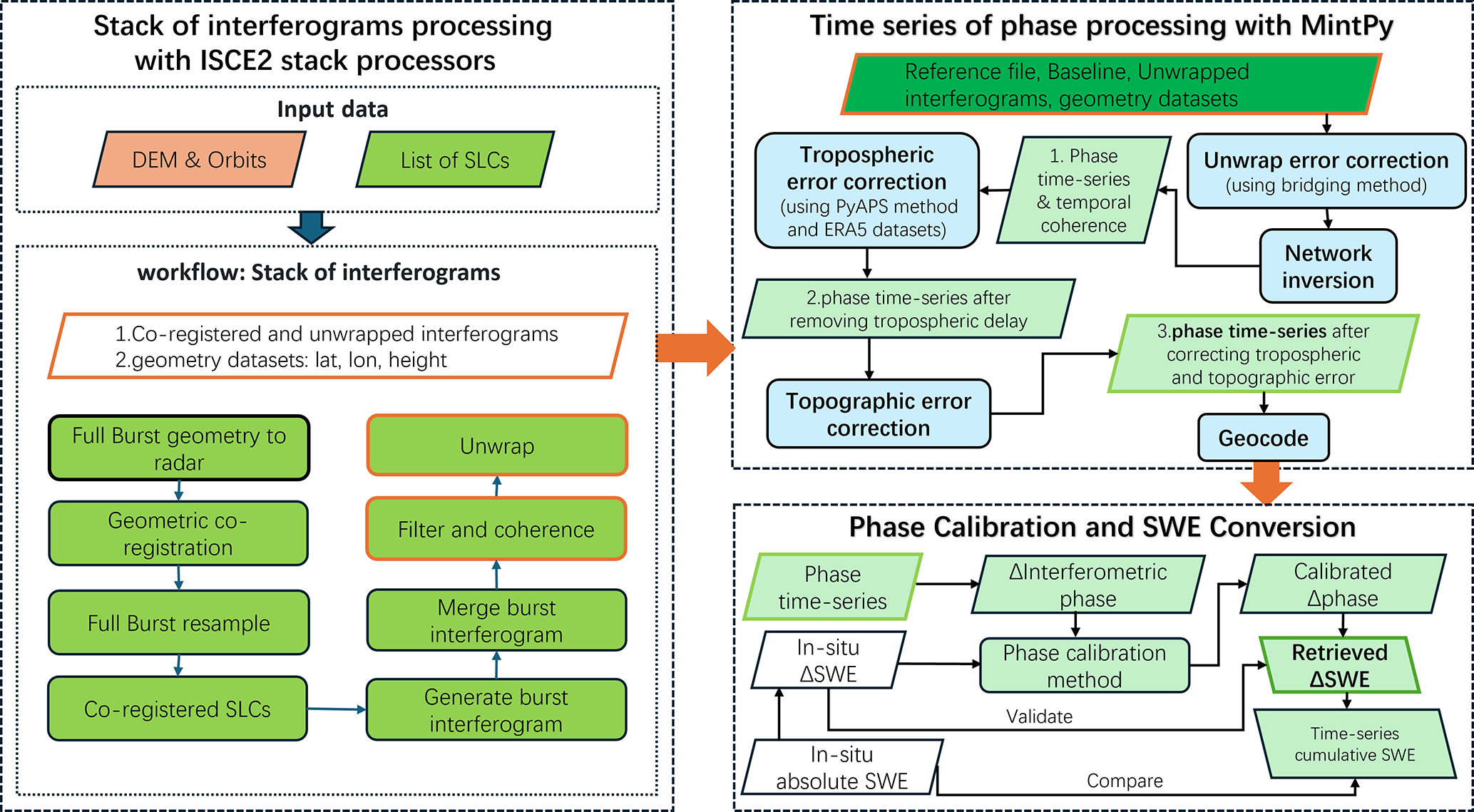 The InSAR stack processing is performed using the NASA/JPL's open-source software ISCE2 (https://github.com/isce-framework/isce2, last access: 28 October 2025) along with the time series tool MintPy (https://github.com/insarlab/MintPy, last access: 28 October 2025). As shown in Fig. 4, the workflow consists of three main blocks: (i) InSAR stack processing for Sentinel-1 TOPS data using ISCE (Fattahi et al., 2016), (ii) InSAR time series analysis from a stack of unwrapped interferograms to phase time-series using MintPy (Yunjun et al., 2019), and (iii) phase calibration and SWE inversion.