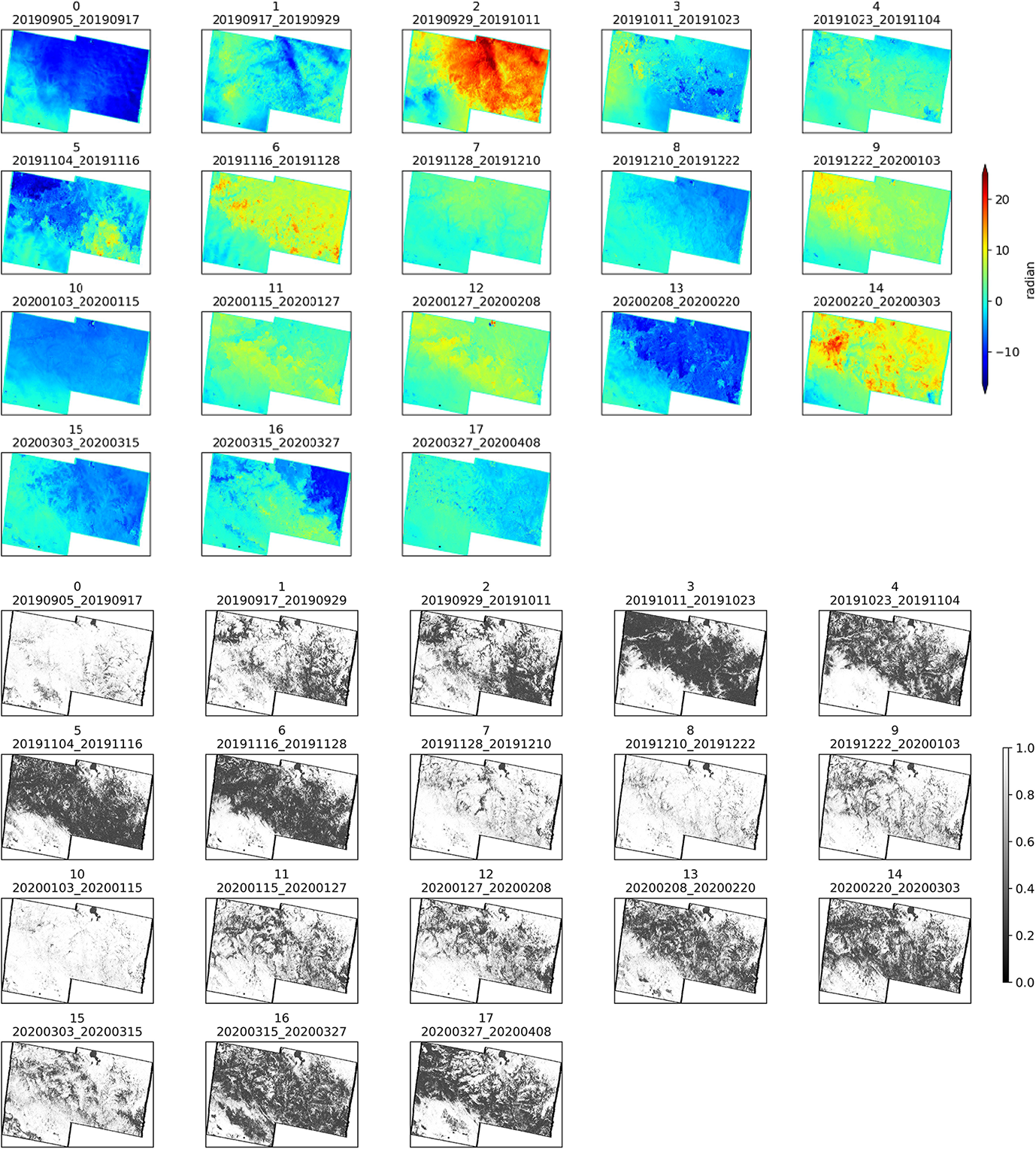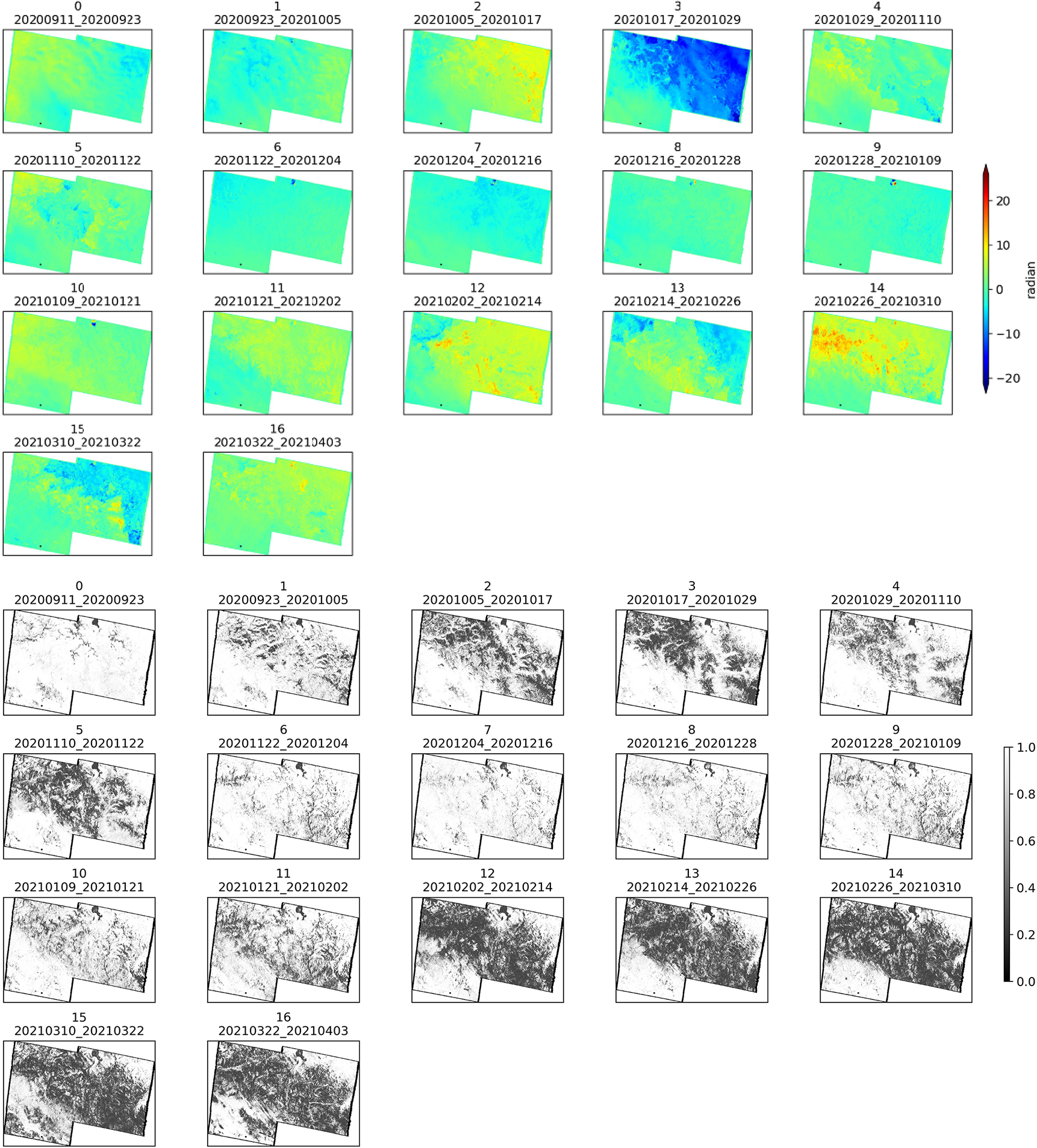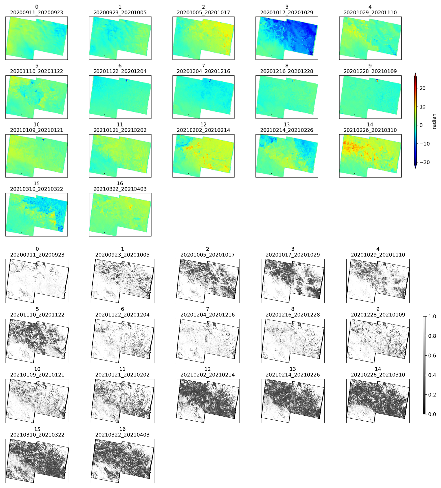 The European Space Agency's (ESA) Copernicus Sentinel-1 mission began in 2014 with the launch of Sentinel-1A on 3 April 2014, followed by Sentinel-1B on 25 April 2016. Each satellite has a 12 d repeat cycle. They orbit 180° apart, together imaging the Earth every 6 d but only in limited regions, which are predominantly over Europe (Kellndorfer et al., 2022). Sentinel-1 supports dual polarization and delivers products quickly. The data can be freely accessed from the Alaska SAR Facility (ASF, https://search.asf.alaska.edu/, last access: 28 October 2025). The Sentinel-1 radar operates at C-band (5.405 GHz) and offers four imaging modes. These modes vary in resolution, reaching as fine as 5 m, and cover up to 400 km. The operational mode used in this study is the Interferometric Wide swath (IW) mode, which operates as TOPS mode, offering a large swath width of 250 km with a ground resolution of 5 × 20 m in range and azimuth, respectively (Torres et al., 2012). Hence, a 15 × 5 (range × azimuth) multilooking is applied, resulting in a final resolution of 75 × 100 m. For this study, Sentinel-1 Single Look Complex (SLC) data is collected over the Altay region. 19 scenes were acquired every 12 d from 5 September 2019 to 8 April 2020, and 18 scenes from 11 September 2020 to 3 April 2021. All data correspond to a descending flight direction with an overpass time of approximately 00:13 UTC, with the local Beijing time being 08:13 (UTC+8), path 19, frame 434.