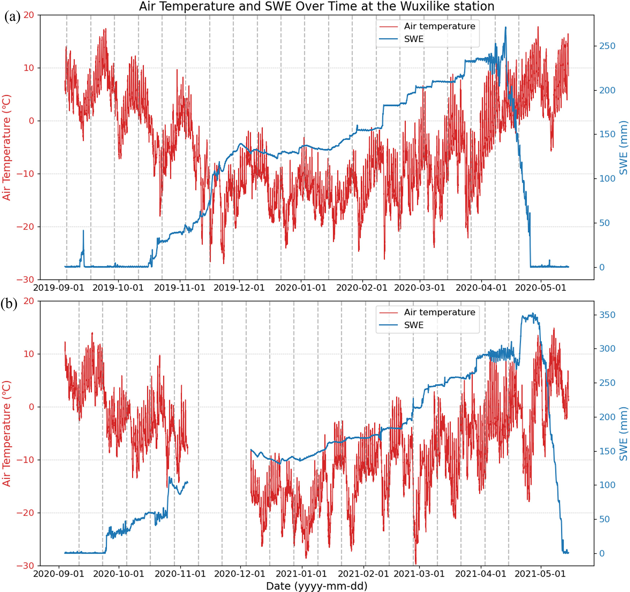 To ensure spatiotemporal consistency with satellite overpasses, snow depth data recorded closest to the satellite observation time are selected (00:00 UTC, 08:00 Beijing local time). When minor gaps exist in the snow depth time series on the required dates, missing values are filled by averaging observations from adjacent available dates. Subsequently, snow density from the ERA5-Land dataset corresponding to the same location and time is extracted. SWE is then estimated by multiplying the snow depth by the corresponding ERA5-Land snow density.