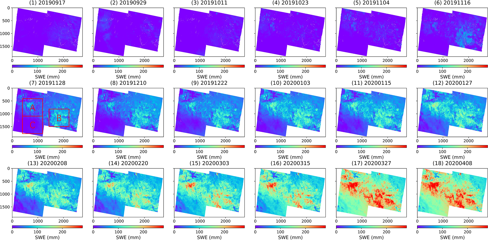 These results demonstrate that our phase calibration is essential for improving the accuracy of InSAR-based ΔSWE retrieval. While the integer multiple of 2π accounts for the main portion of the phase error, the residual phase (that is caused by data processing errors, DEM residual error, atmospheric delays, systematic phase calibration error, etc) still has a noticeable effect. Comparison to case (A), case (B) and (C) show lower RMSE and bias, as well as a higher correlation, confirming the importance of calibrating the residual phase component. It can also be observed that the overall performance is improved through phase calibration, while some points with initially good agreement deviate from their previous alignment. In conclusion, the best accuracy can be achieved when the full calibration parameter (i.e., case (C)) is applied.