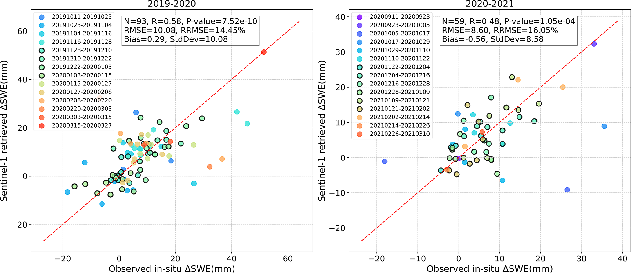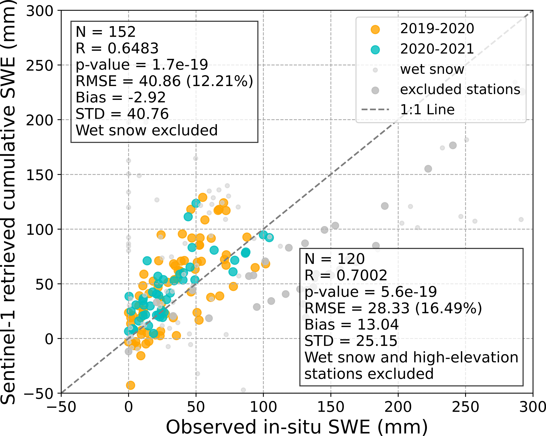 The accuracy of cumulative SWE is directly influenced by the accuracy of ΔSWE, since cumulative SWE is calculated by accumulating ΔSWE values. For example, when ΔSWE is close to the 1 : 1 line, most of the cumulative points is also observed to be close to the 1 : 1 line, as shown in Fig. 22. However, as cumulative SWE increases, it tends to scatter more from the 1 : 1 line, showing a consistent trend of overestimation or underestimation through error propagation based on the time series accumulation. In contrast, there are cases where the ΔSWE's validation does not show a good relationship, yet the cumulative SWE does, as shown in Fig. 23. Similarly, with higher cumulative SWE values, data points increasingly deviate from the 1 : 1 line. Factors such as removing tropospheric error during processing may contribute to these discrepancies. Additionally, the reason may be variations in the station environment and errors in the in-situ data observations. The cumulative SWE is more prone to random error, which propagates to other pairs.