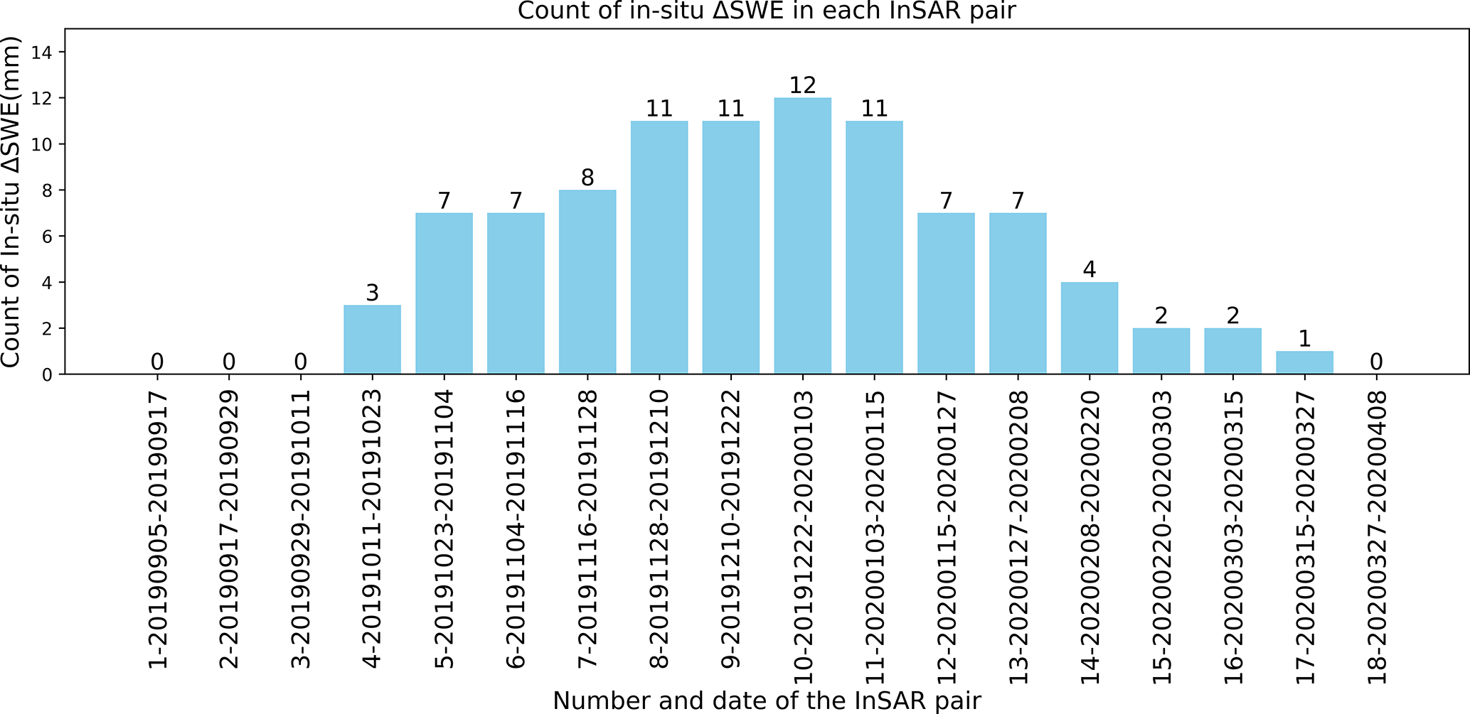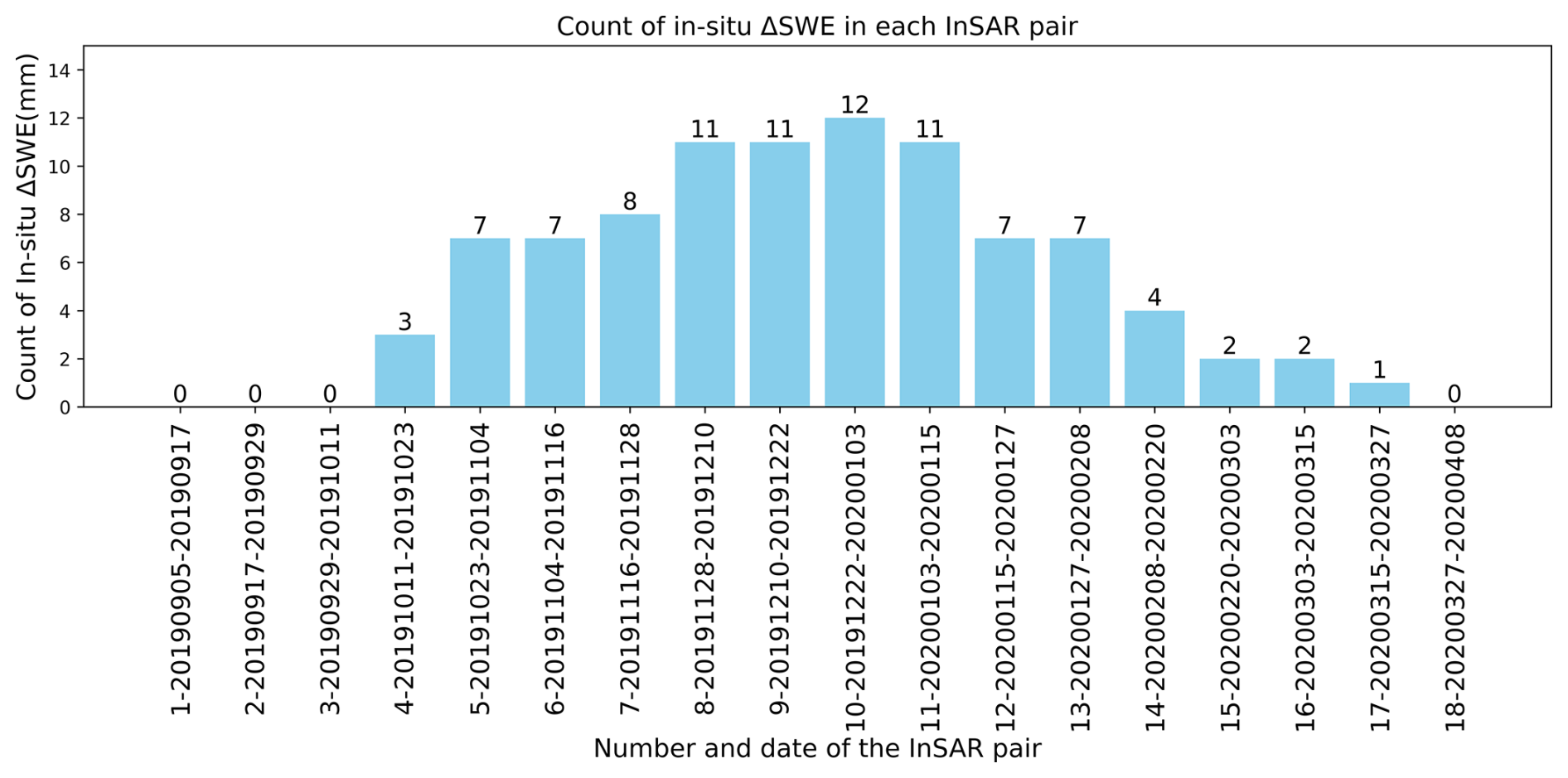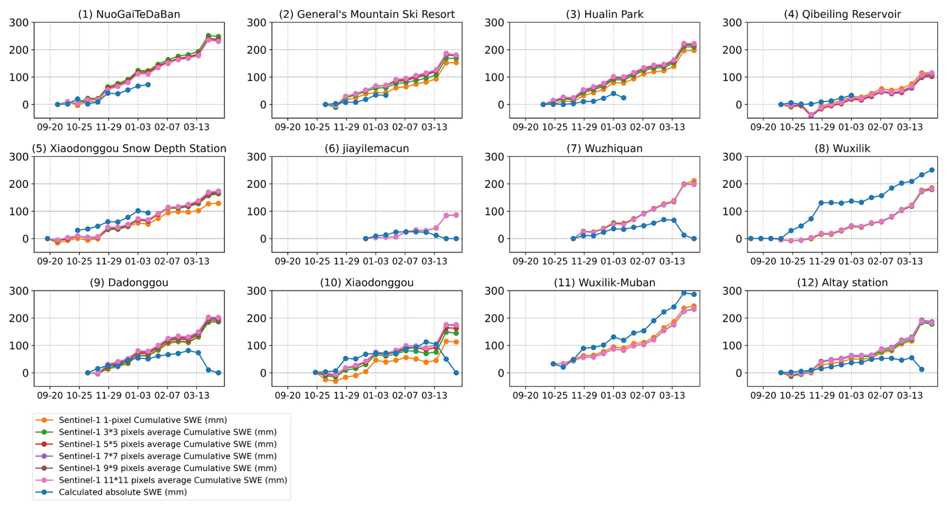 Regarding potential limitations, on one hand, it is noted that for the InSAR method to invert SWE effectively, longer wavelengths and shorter revisit times (which improve coherence) are necessary, as well as longer time series observations for better atmospheric effect estimation. This study uses C-band data with a 12 d revisit period, which can be improved using lower frequency bands (L-band) and shorter revisit intervals. On the other hand, stations that directly measure SWE are preferred, as many stations require snow density data, introducing some uncertainty into observations. Visual interpretation errors in snow depth measurements through snow poles monitored with time-lapse cameras may also happen, particularly in sloped locations, which could amplify uncertainties. Despite these limitations, our validation results are still reasonable, providing a valuable reference for the broader application of 12 d revisited Sentinel data in SWE inversion studies.