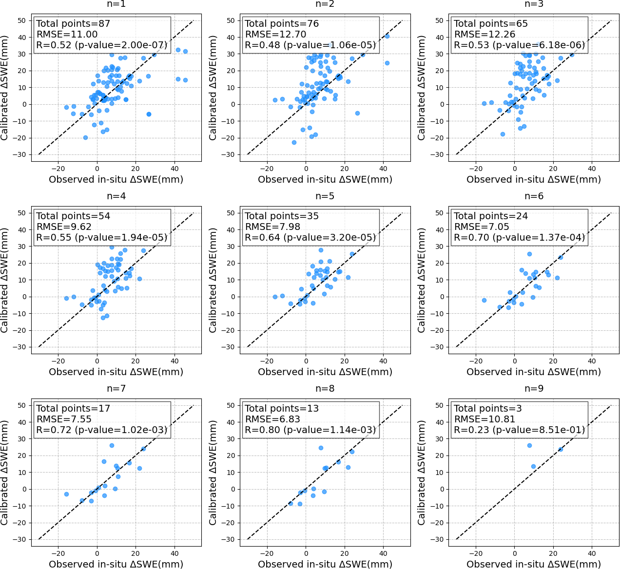 Based on the distribution of in-situ vs. retrieved ΔSWE (rather than cumulative SWE validation) at individual stations, comparison data are grouped into two categories: one with better agreement (more clustered along the 1 : 1 line, Fig. 22) and one with poorer agreement (more scattered, Fig. 23).