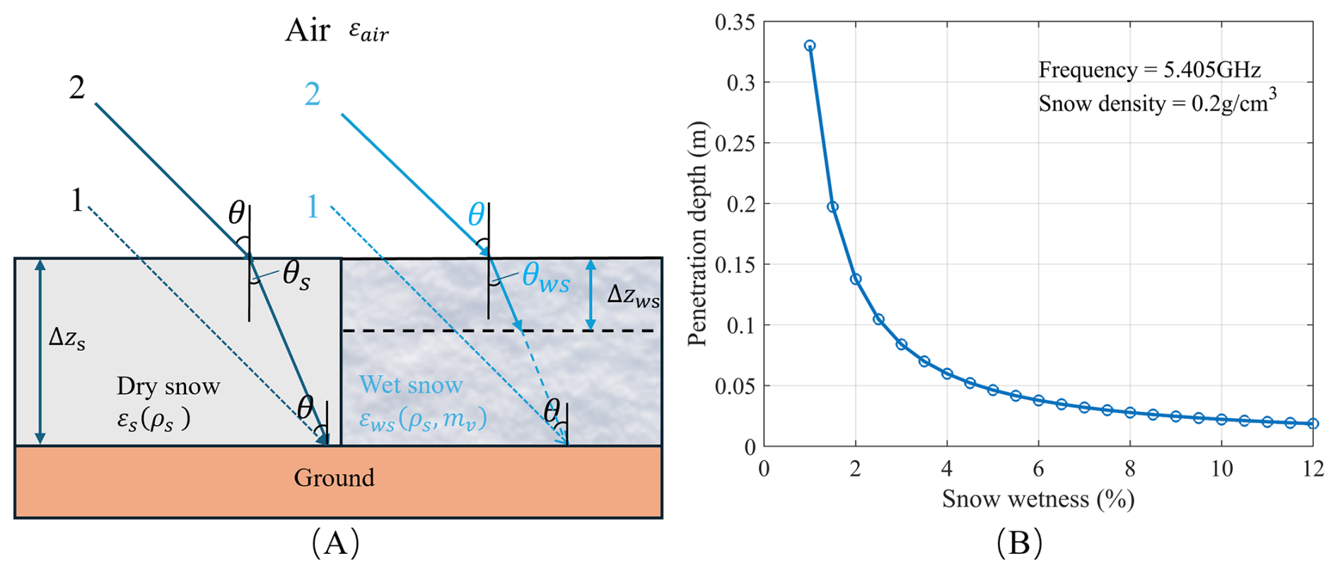 Because snow has a different dielectric constant from air, radar waves undergo refraction as they propagate through a snow layer. When comparing the optical path lengths of radar waves without and with snow conditions, a path delay can be observed. The delay arises from the change in optical path length, given by ns (where n is the refractive index and s is the geometric path length), caused by refraction within the snowpack and the reduced propagation velocity of radar waves in snow compared to air. The signal delay can be derived from the geometry path illustrated in Fig. 3. For conditions without snow, the radar wave travels the distance CA, while for snow-covered conditions, the distance is DE + EA. Furthermore, this path delay also occurs when there is a change in snow depth ΔZs, between two measurements, with the delay being proportional to ΔZs. This delay in path length induces a differential interferometric synthetic aperture radar (DInSAR) phase difference, which can be correlated with the change in snow depth.