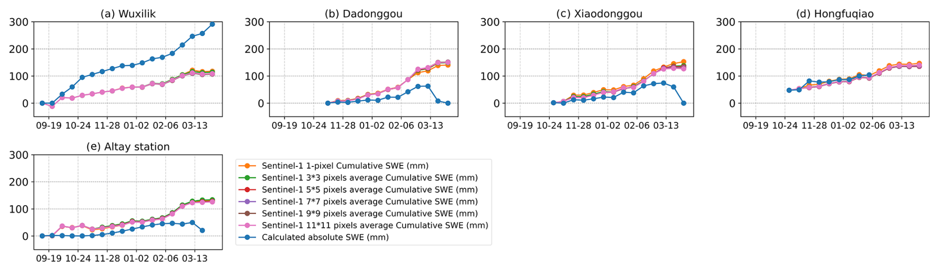 Figure 23Comparison between the in-situ SWE changes and the Sentinel-1 InSAR retrieved SWE changes at the other three stations in Altay.