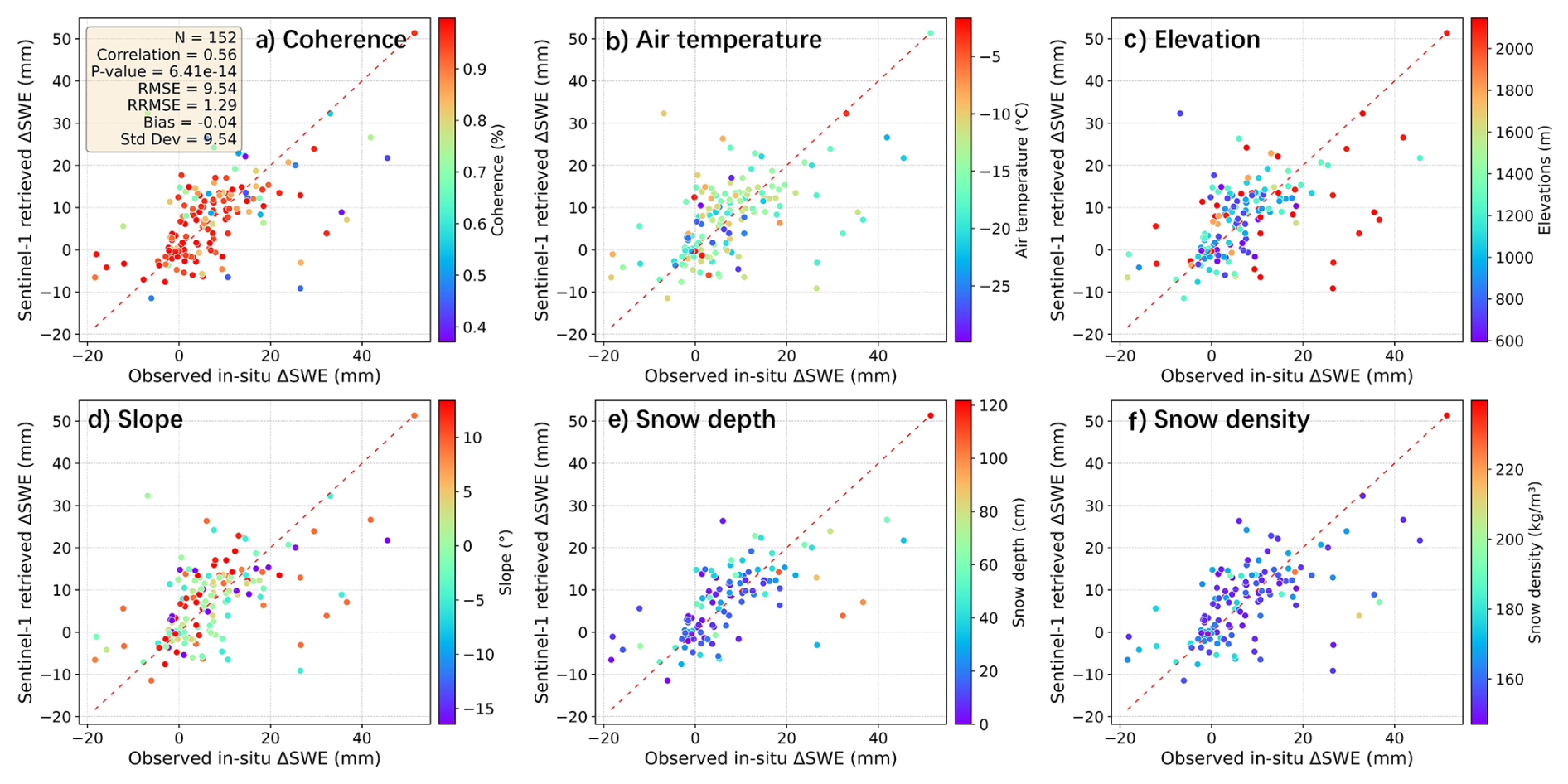 This section investigates the influence of various factors, including coherence, air temperature, elevation, slope, snow depth, and snow density, on the validation of retrieved ΔSWE, as illustrated in Fig. 19. Those with lower coherence (purple) become more scattered, as shown in Fig. 19(a). As shown in Fig. 19(b), the lowest temperature (purple) values cluster around the 1 : 1 line. Points at lower elevations (Fig. 19(c)) appear more accurate, and red points at high altitudes tend to show an underestimation. For Fig. 19(e) and (f), the purple points corresponding to lower values of snow depth (about 15 cm) and snow density (about 150 kg m−3) appear more concentrated compared to higher values.