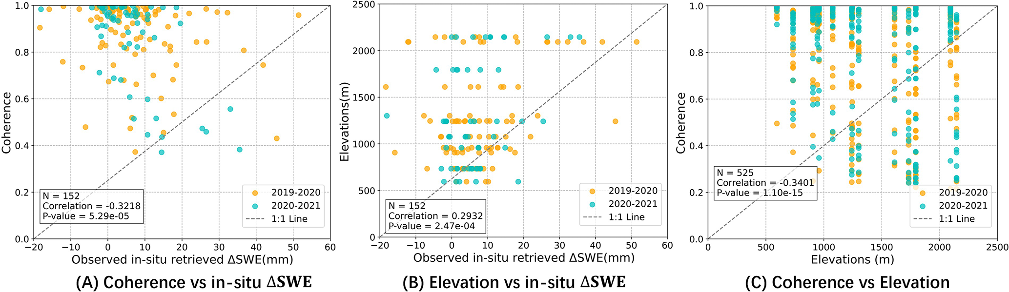 Figure 20Analysis of coherence and topographic effects on in-situ ΔSWE. (A) Coherence vs. in-situ ΔSWE, (B) Elevation vs. in-situ ΔSWE and (C) Coherence vs. Elevation.