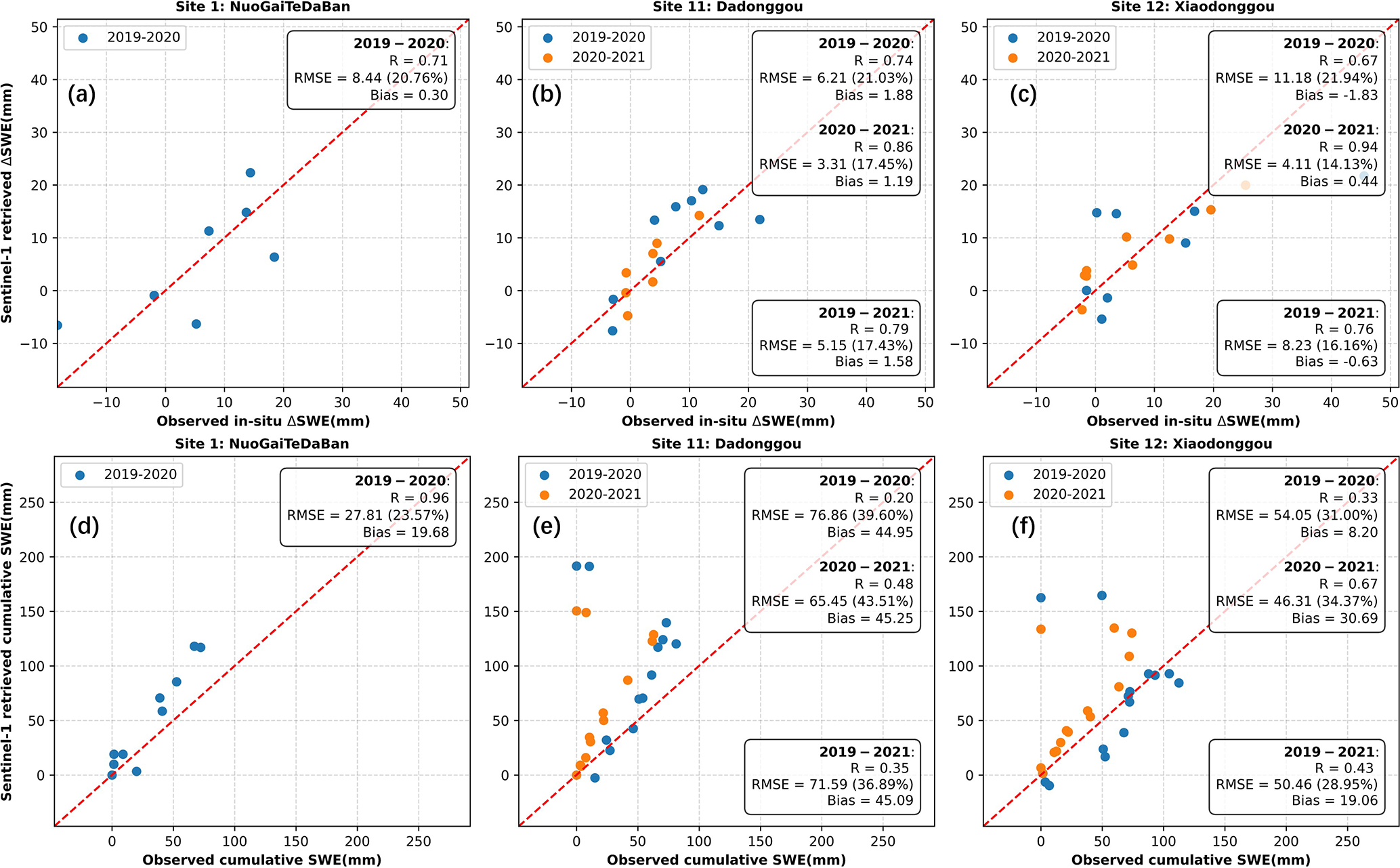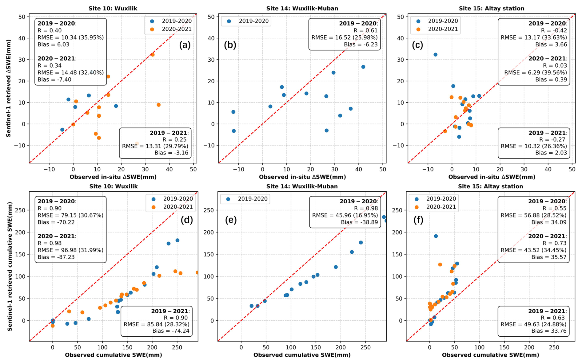 Figure 22Comparison between the in-situ SWE changes and the Sentinel-1 InSAR retrieved SWE changes at three stations in Altay. (The top row is ΔSWE, and the bottom row is cumulative SWE; each column corresponds to the same station.)