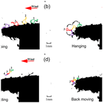 Near-surface moving particles were captured using a high-speed camera. Creeping (particles rolling or sliding over the surface before settling) and saltating (particles successively jumping over the surface before settling) (Bagnold, 2012) are the two primary modes contributing to cornice growth. Particles in creeping mode, predominantly larger particles, exhibit two distinct patterns of adherence to the snow cornice surface. One pattern involves particles slowly rolling forward and stopping at a certain point, referred to as “creeping” (Fig. 8a), while the other involves particles rolling to the edge, where they are captured through interlocking with the dendritic structure, termed “hanging” (Fig. 8b). These two patterns together account for approximately 14 % of the total adhered particles and typically move slowly. In contrast, most of the adhered particles are transported primarily via saltation. Among these, approximately 82 % of the total adhered particles deposit before reaching the front end of the snow cornice, which we refer to as “impact” (Fig. 8c). About 4 % of the total adhered particles are saltating particles that detach from the edge, move back, and are recaptured by the snow cornice edge, influenced by reflux vortex (Yu et al., 2025) or the potential electric field (Yu et al., 2022), a process we term “back moving” (Fig. 8d).