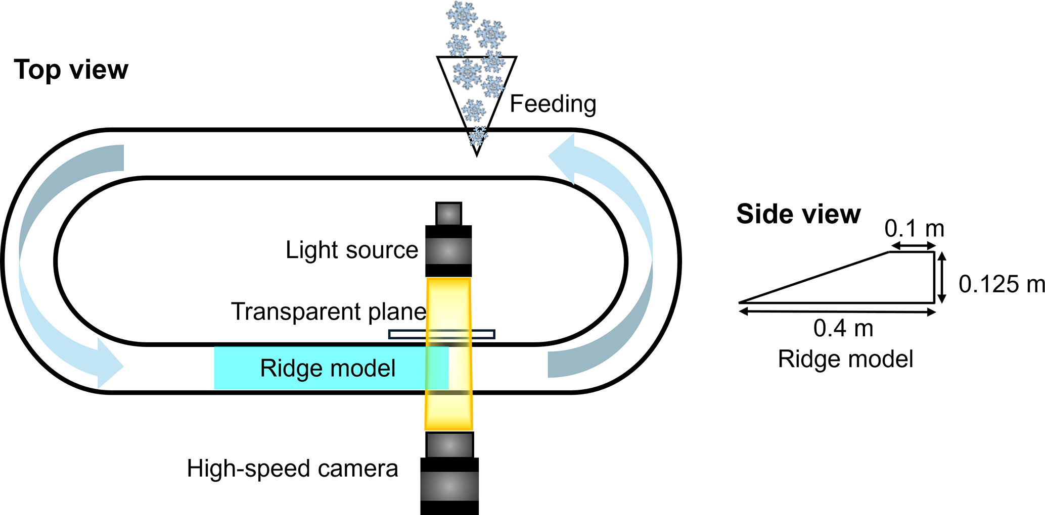 The wind-tunnel experiments are carried out in a ring wind tunnel in the cold lab of the WSL Institute for Snow and Avalanche Research, in Davos, Switzerland. The experiment setup is shown in Fig. 2. The working section of the wind tunnel is 1 m in length, with a cross-section area of 0.2 m (width) × 0.5 m (height), and has been successfully used for several drifting snow experiments (Wahl et al., 2024; Walter et al., 2024; Yu et al., 2023; Sommer et al., 2017, 2018a). Further details of the wind tunnel can be found in Yu et al. (2023). For tracing particle trajectories, a high-speed camera system is deployed. A feeding system is used to supply snow particles. The feeding rate of snow particles is manually kept stable. The snow particles are produced by a snow maker (Schleef et al., 2014). The geometrical diameters are 300–500 µm, and the shape of the snow crystals is dendritic, visually analyzed under a microscope. The room temperature of the cold lab is controlled and set at −5 °C, and the wind speed is kept at 4 m s−1. The wind speed inside the wind tunnel is nearly uniform with a very thin (around 2 cm) boundary layer (Sommer et al., 2017; Yu et al., 2023). A ridge model with a fixed size (height 0.125 m, total length 0.4 m, flat surface length 0.1 m) is built with compacted snow before each experiment, and its side view is shown in Fig. 2.