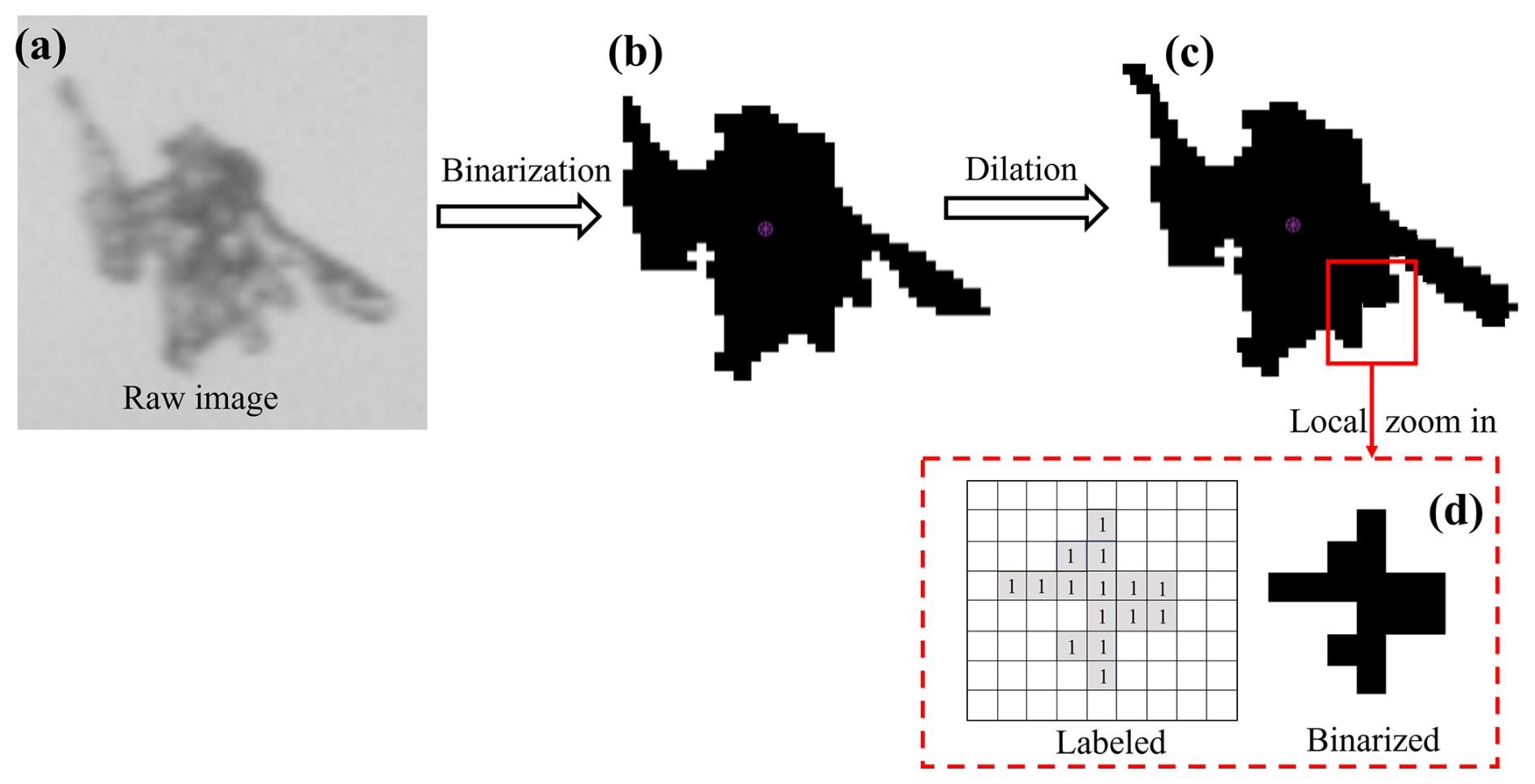 Particle size as recognized by the first-time binary analysis using the second threshold gray value is normally smaller than its real size, as shown in Fig. 3a–b. To compensate for the underestimated particle areas caused by binarization, a dilation process (Gonzalez and Woods, 2017) is applied after the binarization, which fills the small spaces around the snow particle and smooths the particle's boundary, as depicted in Fig. 3c and its zoomed-in counterpart in Fig. 3d.