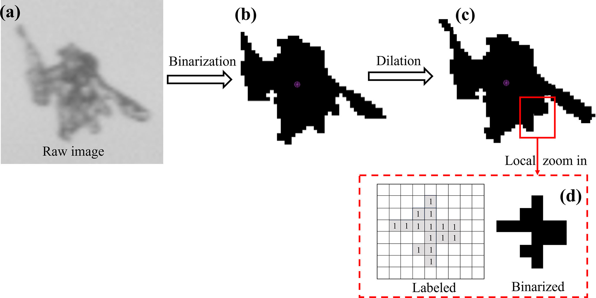 After the above image pre-processing, particle recognition is carried out by using the Seed-Filling Algorithm (SFA). SFA is an algorithm used to fill closed regions in an image. It starts from a seed point and gradually fills the regions adjacent to it with the same color until the boundary is reached. Snow particle area is calculated based on the connected component label analysis (CCLA), a common image processing method for connecting the adjacent foreground pixels that have the same pixel value (Di Stefano and Bulgarelli, 1999; Rafael and Richard, 1993).