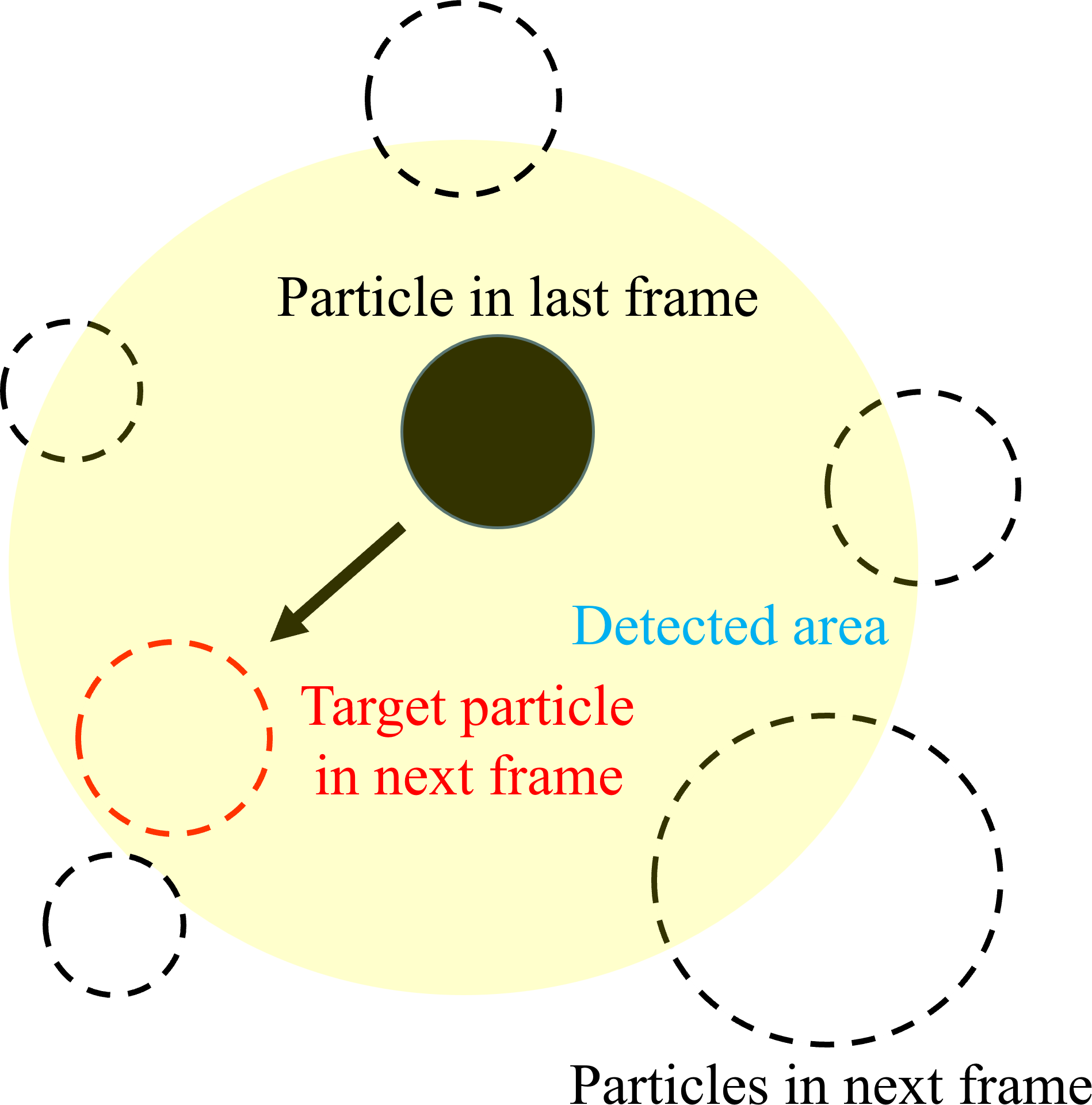 Figure 4Schematic of particle detection method in post-processing high-speed camera images. The full circle is the particle from the last frame, the dashed circle is the particles from the second frame, and the yellow region is the predefined search area.