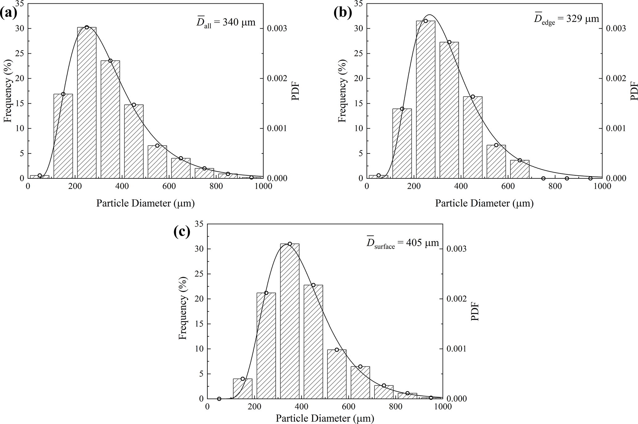 To investigate the differences between edge and surface particles, we analyzed the adhering particle's size distribution, impact velocity, and impact angle in the following sections.