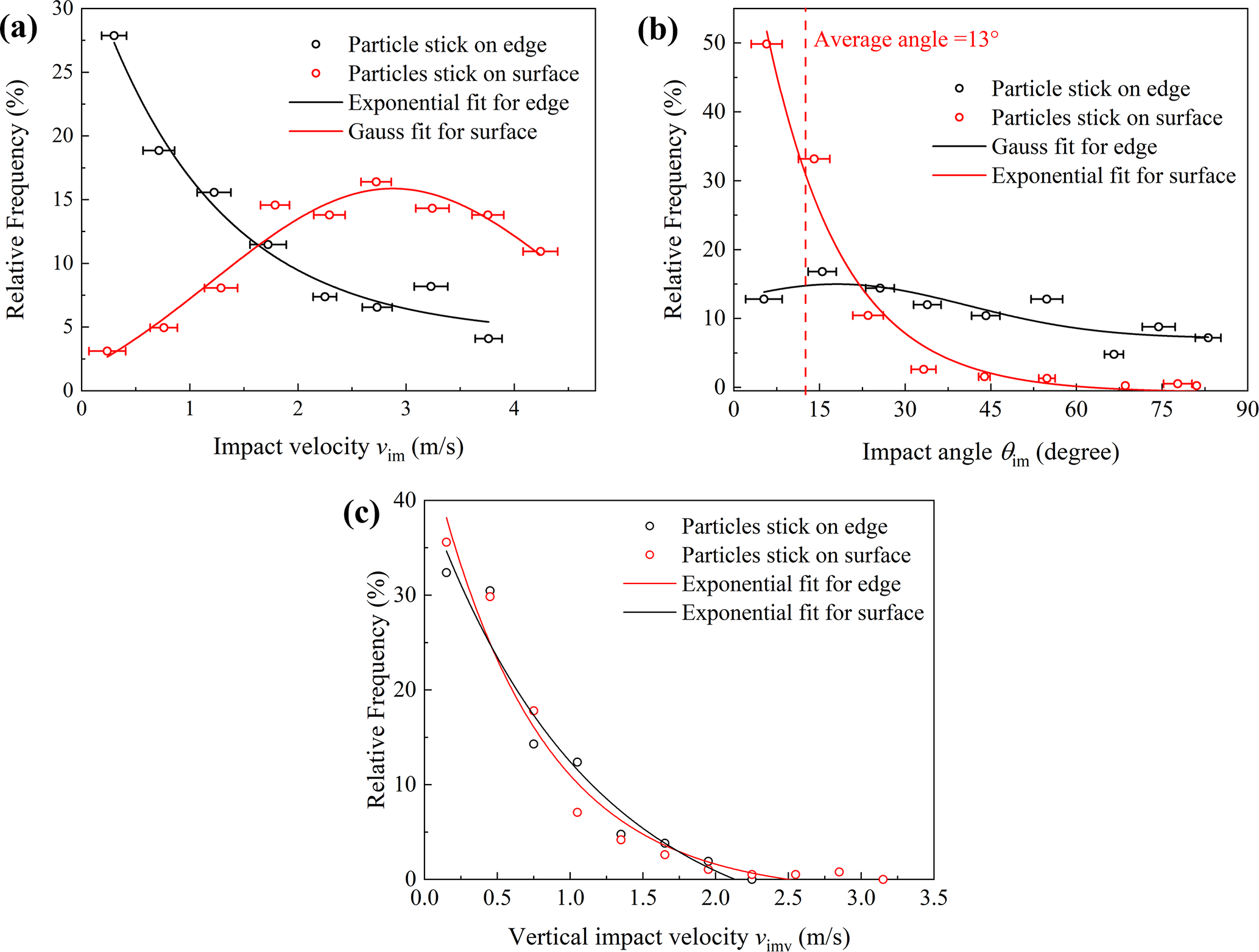 Figure 9Relative frequencies of (a) impact velocity, (b) impact angle, and (c) vertical impact velocity of particles adhering to the edge and surface.