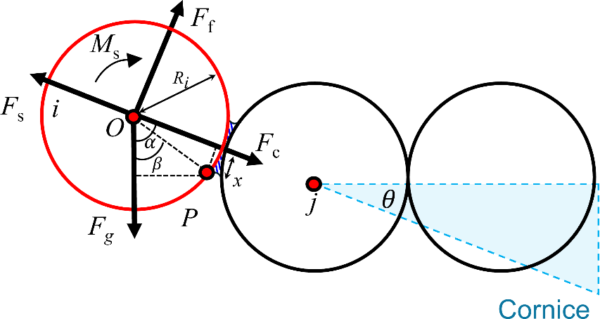 Considering the differences in particle size distribution between the edge particles and surface particles, we conducted a static analysis of the particles at the edge. As shown in Fig. 10, a newly deposited particle i adheres to the foremost particle j at the edge of the cornice. Particle i is subjected to gravity Fg, the cohesive force Fc exerted by particle j, and the frictional force Ff at the contact surface. Due to the separation of flow, the wind velocity and surface shear stress near the edge of the cornice are close to zero (Shehadi, 2018; DeBonis, 2022; Yu et al., 2025), allowing the drag and lift forces acting on particle i to be neglected compared to other forces (Schmidt, 1980).