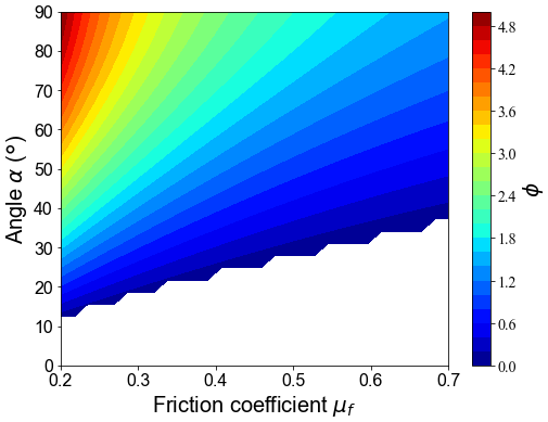 Meanwhile, the right side of Eq. (9) can be defined as a function ϕ, which is affected by the ratio δ, angle α, and friction coefficient μf: