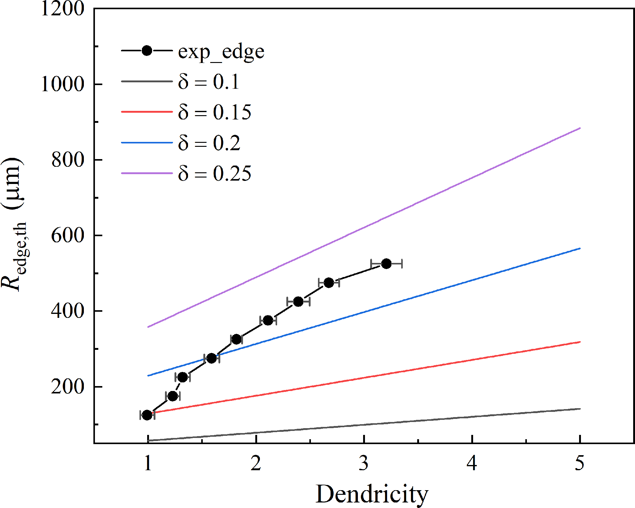 For each δ, the threshold radius Rth increases linearly with dendricity, as is shown in the Fig. 12. A higher value of the ratio δ indicates a larger contact surface, which in turn allows larger particles to adhere to the edge. δ is mainly dependent on the air temperature and relative humidity (Colbeck, 1982). Furthermore, we divided the radius into different bins based on the dendricity values. By comparing the averaged radius of various dendricity, we found that the experimental result is in good agreement with the model-predicted results. The experimental data lie between the theoretical curves for δ=0.15 and δ=0.25. It can be concluded that the maximum particle size capable of adhering to the edge increases with increasing dendricity. Which means greater dendricity enables larger particles to remain attached, suggesting that the complexity of the particle shape helps counteract gravity.