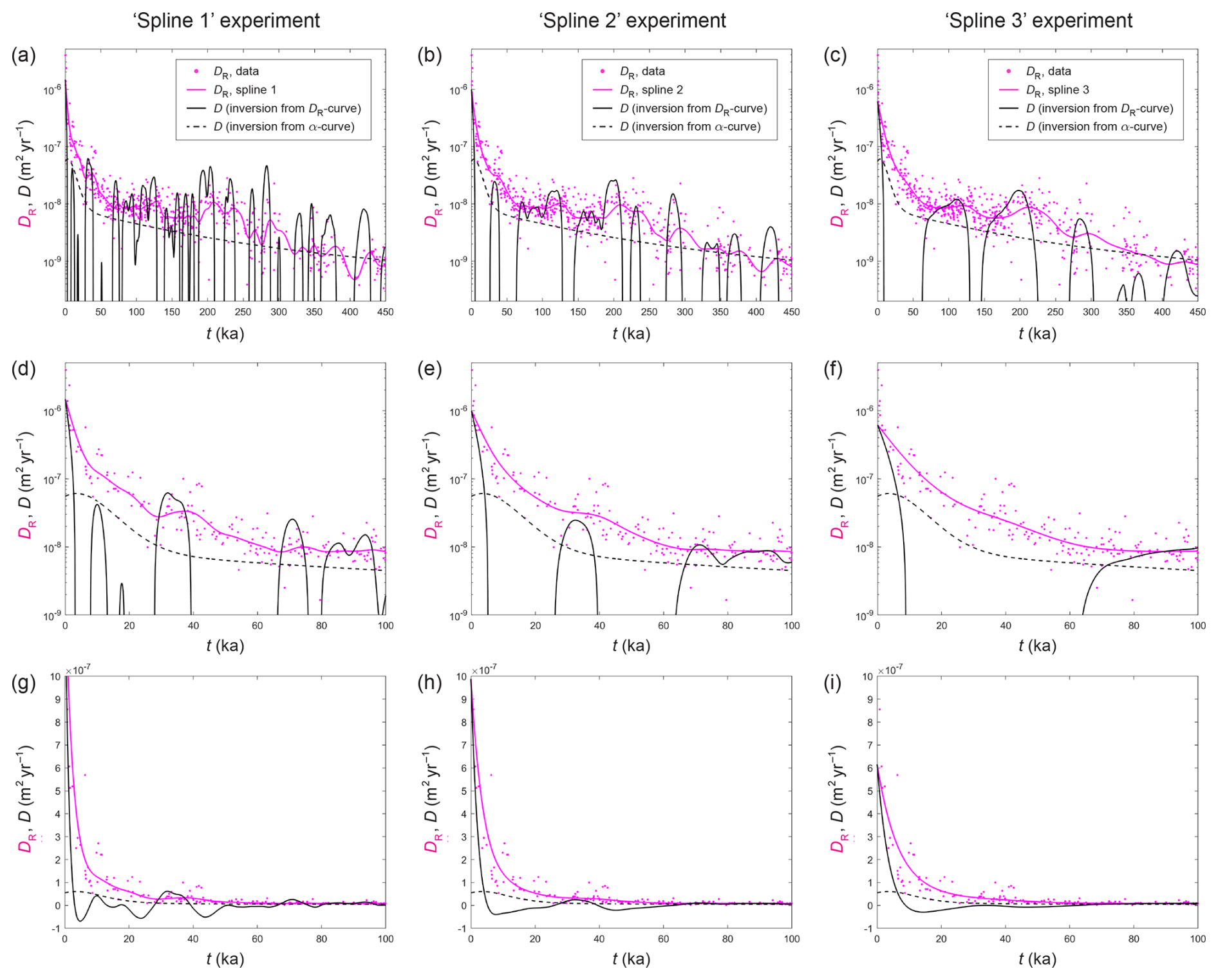 Figure 5Analytical inversions for D(t) from DR. The left, middle, and right columns of panels document three different experiments where the curves of DR serving as input to the inversion (“Splines 1, 2 and 3”; magenta curves) have been derived by spline-fitting the DR point data at different smoothness. The level of spline smoothing increases from left to right. In each panel, magenta circles plot the DR data from Fig. 4b; black curve shows D(t) obtained by using Eq. (20) with the chosen spline for DR; dashed black curve shows D(t) obtained by using Eq. (7) with the two-term exponential curve of α in Fig. 4a as input. Each row of panels displays results on the same axes: (a–c) over 450 ka; (d–f) over the last 100 ka in log scale; (g–i) over the last 100 ka in linear scale.