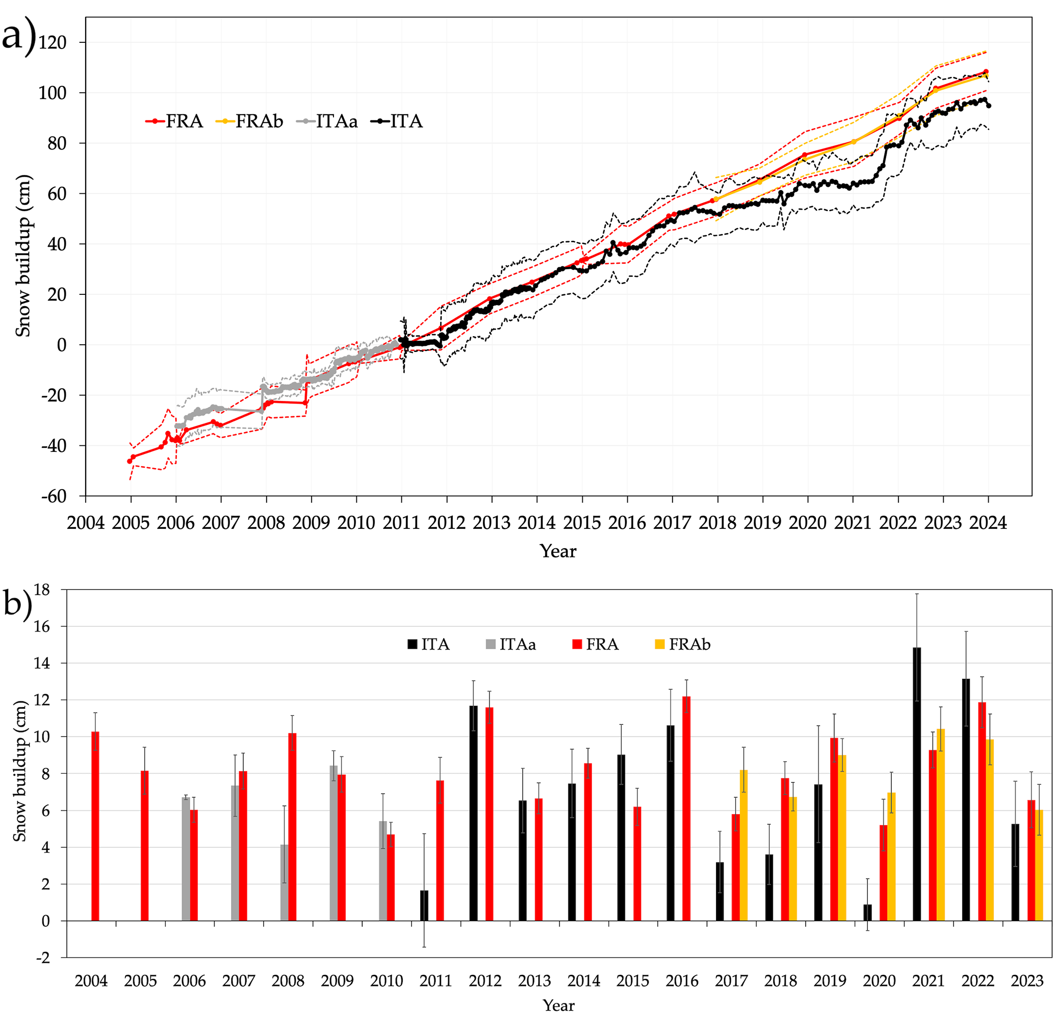 Figure 4(a) Cumulative snow buildup from the Italian and French stake farms near Concordia Station with respect to the beginning of 2011. Continuous coloured lines connect the mean values while the dashed lines indicate ±1 standard deviation of each dataset; (b) yearly mean snow buildup from the Italian and French stake farms near Concordia Station. The uncertainty bars indicate the standard errors of the mean values.