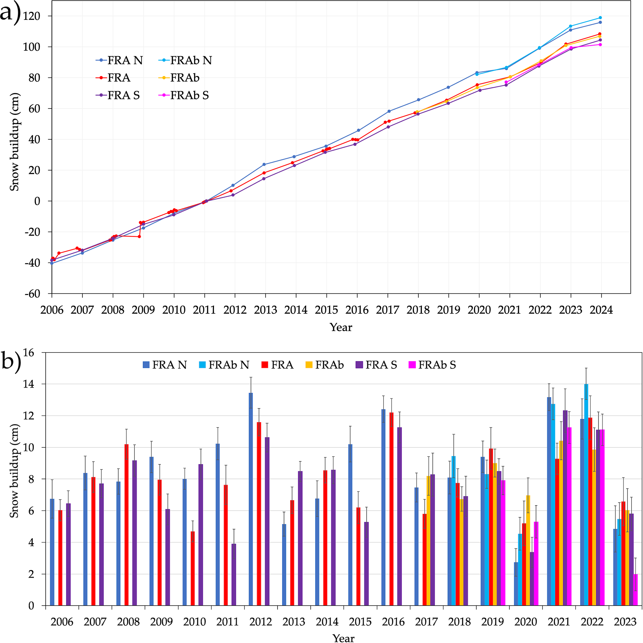 The mean SB and snow compaction δb have also been evaluated for the northern and southern stake farms; results are shown in Tables 4 and 5, respectively, jointly with the FRA and FRAb values evaluated over the same intervals. Note that only from 2019 the new stake farms FRAb, FRAb-N, FRAb-S, are all available.