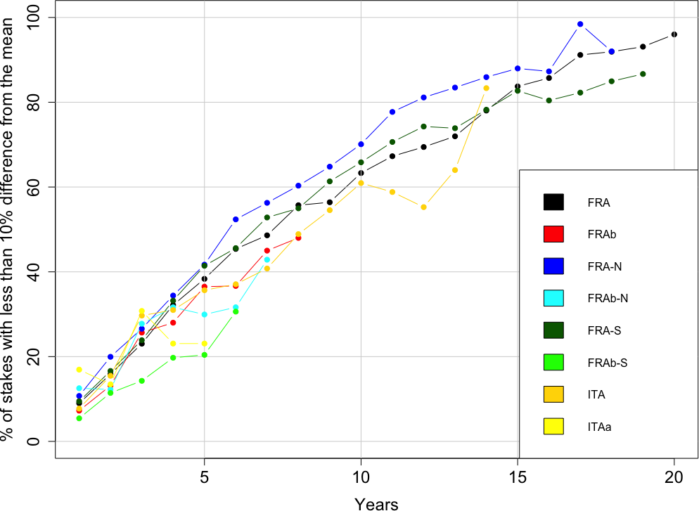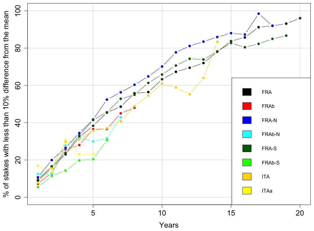 Representativeness of the stake farms over time has also been evaluated. Following Frezzotti et al. (2007), for each stake farm the percentage of stakes with an accumulation difference with respect to the average less than ±10 % is shown in Fig. 9, for different number of years. Thus, for 1 year only ∼10 %–15 % of the stakes have measurements which differ less than 10 % from the average of the belonging stake farm, for a running mean of 5 years this percentage increases to ∼20 %–40 %, at 10 years it is ∼60 %–70 % and afterwards the increase is less steep. Note that the ITA stake farm takes more time (a couple of years on average for intervals >5 years) to reach the representativeness of the French stake farms. The causes of the different behaviour of the ITA and FRA stake farms are explored in the next Section (4.3). Thus, excluding the peculiar case of ITA, the time required for the SB measured at a stake farm in the Dome C area to overcome the noise induced by the local micro-relief, i.e., reaching the 70 % threshold of the number of stakes with difference less than 10 % compared to the average, is 10–12 years.