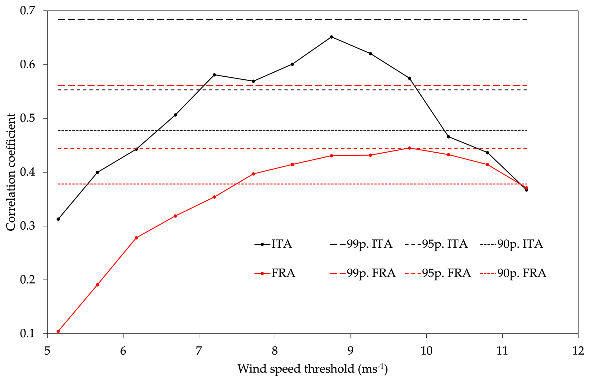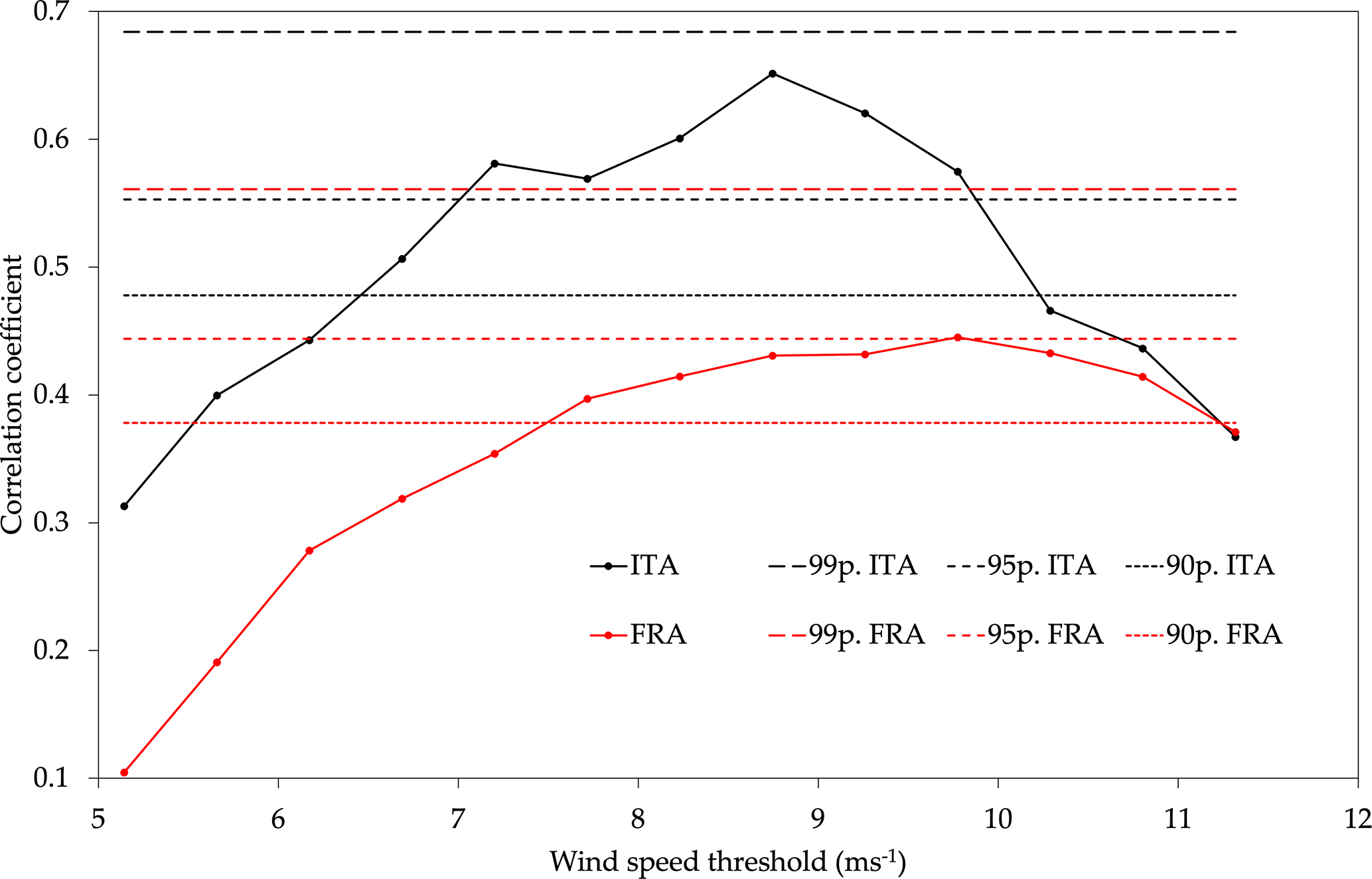 The ITAa series has values similar to the FRA one but it is short, and these effects are not appreciated. The effect of the turbulence has been investigated comparing the annual percentage of stakes observing erosion with the frequency of wind speed values at the AWS above certain thresholds. The maximum linear correlation occurs when a threshold of 8.7 m s−1 is considered for the ITA series (r=0.65, p value=0.02), while for FRA the threshold is 9.8 m s−1 (r=0.45, p value=0.05), as shown in Fig. 10.