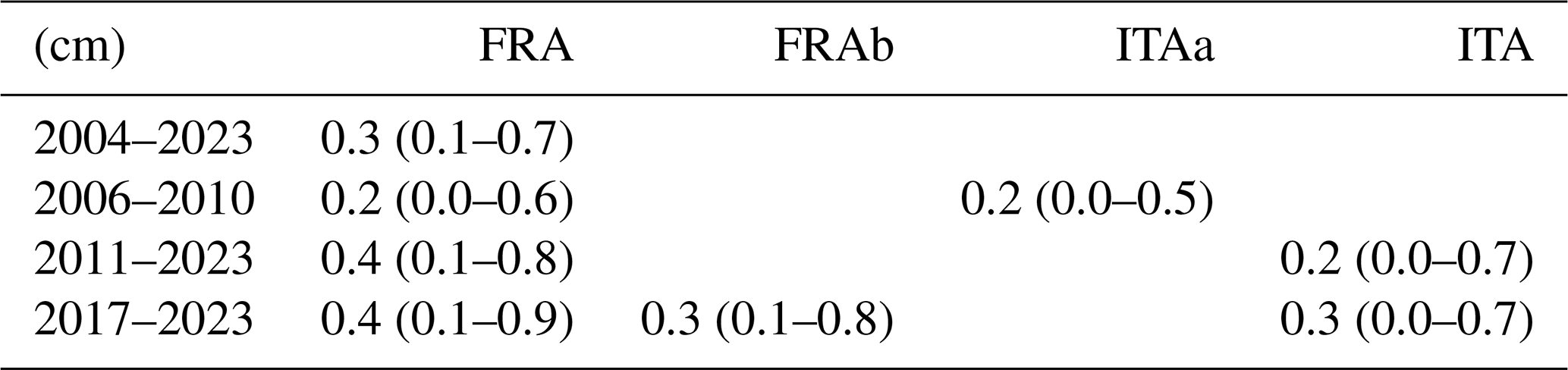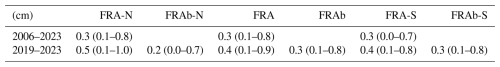 The SB observations and reconstructions are summarized in Table 2. During the longest period of continuous analysis, from 2004 to 2023, only FRA observations are available, providing a mean annual value of 8.2 cm, with a 95 % confidence interval of 8.1–8.4 cm. The maximum possible underestimate for this value due to snow compaction (whose estimation is explained below) is 0.7 cm but it is 0.3 cm on average (Table 3), giving a sum of 8.5 cm. ERA5 and MERRA2 provide the closest reconstructions to this value, 8.5 and 9.1 cm, respectively. During the 2006–2010 period, when both FRA and ITAa observations are available, the mean values they provide are not compatible according to a Student's t-test (p value=0.02). In the 2011–2023 period, mean values of FRA and ITA are not compatible either (p value<0.01). Finally, in the 2017–2023 period, when also FRAb is available, the SBs observed by FRA and FRAb are compatible (p value=0.40), while the value of ITA is not compatible with the one of FRA (p value=0.04), nor with the one of FRAb (p value=0.01). The F-tests performed on the same pairs of datasets indicate that there is no statistical difference (p value>0.05) for the standard deviations.
