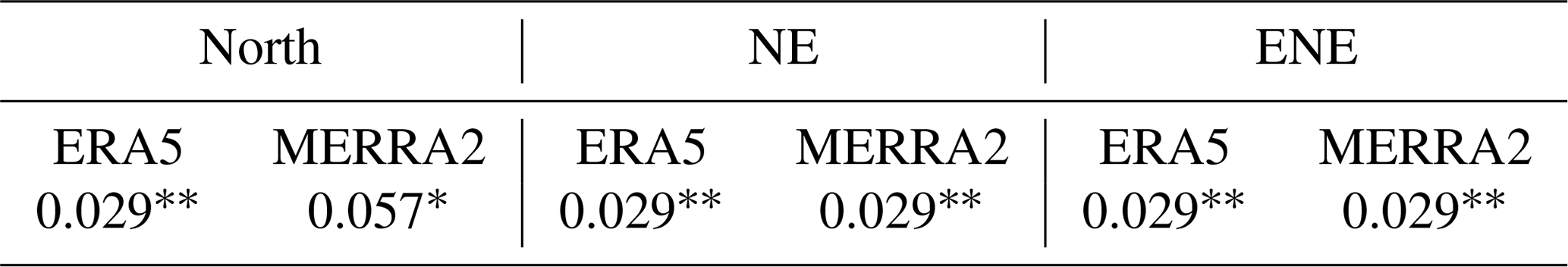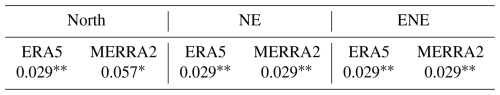 Table 6P values of the Mann-Whitney-Wilcoxon tests performed to assess the differences between the frequency of wind direction (from AWS Concordia) of the “ITA<FRA” and “ITA>FRA” cases for North, NE, and ENE, when considering the snowfall data of ERA5 or MERRA2. and ∗ denote the cases significant at the 95 % and 90 % thresholds, respectively.