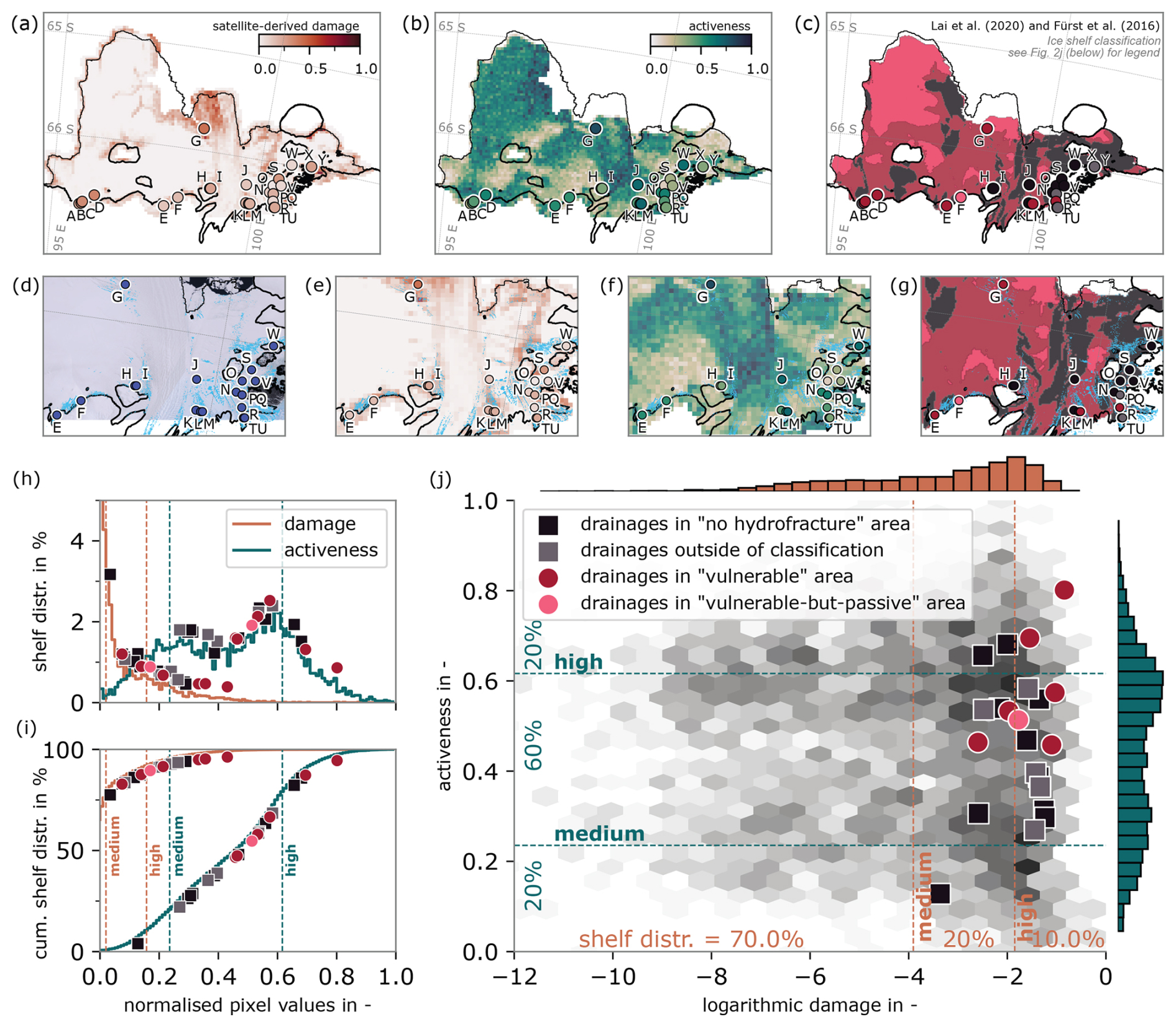Figure 2Spatial occurrence of observed lake drainages on Shackleton ice shelf. (a) presents the satellite-derived damage and (b) the activeness metrics, both for the 2019/20 melt season. (c) shows the comparison to vulnerability to hydrofracturing estimates of Lai et al. (2020), Fürst et al. (2016). Panels (d)–(g) show zoomed section around the glaciers on the ice shelf, with (d) maximum lake extent and (e)–(g) the same as (a)–(c). The superimposed coloured dots display the location of observed drainage events, the colour of each dot represents the respective value at the drainage location for the respective melt season in which it occurred. Thick/thin black line: Grounding and Shelf coastline from MEaSURES data (Gerrish et al., 2022). Panel (h) and (i) show the distribution and the respective cumulative shelf distribution of satellite-derived damage and activeness together with the drainage events and in which area they where found. Panel (j) presents a comparison between satellite-derived damage (in logarithmic scale), activeness, observed drainage and vulnerability to hydrofracturing estimates of Lai et al. (2020), Fürst et al. (2016).