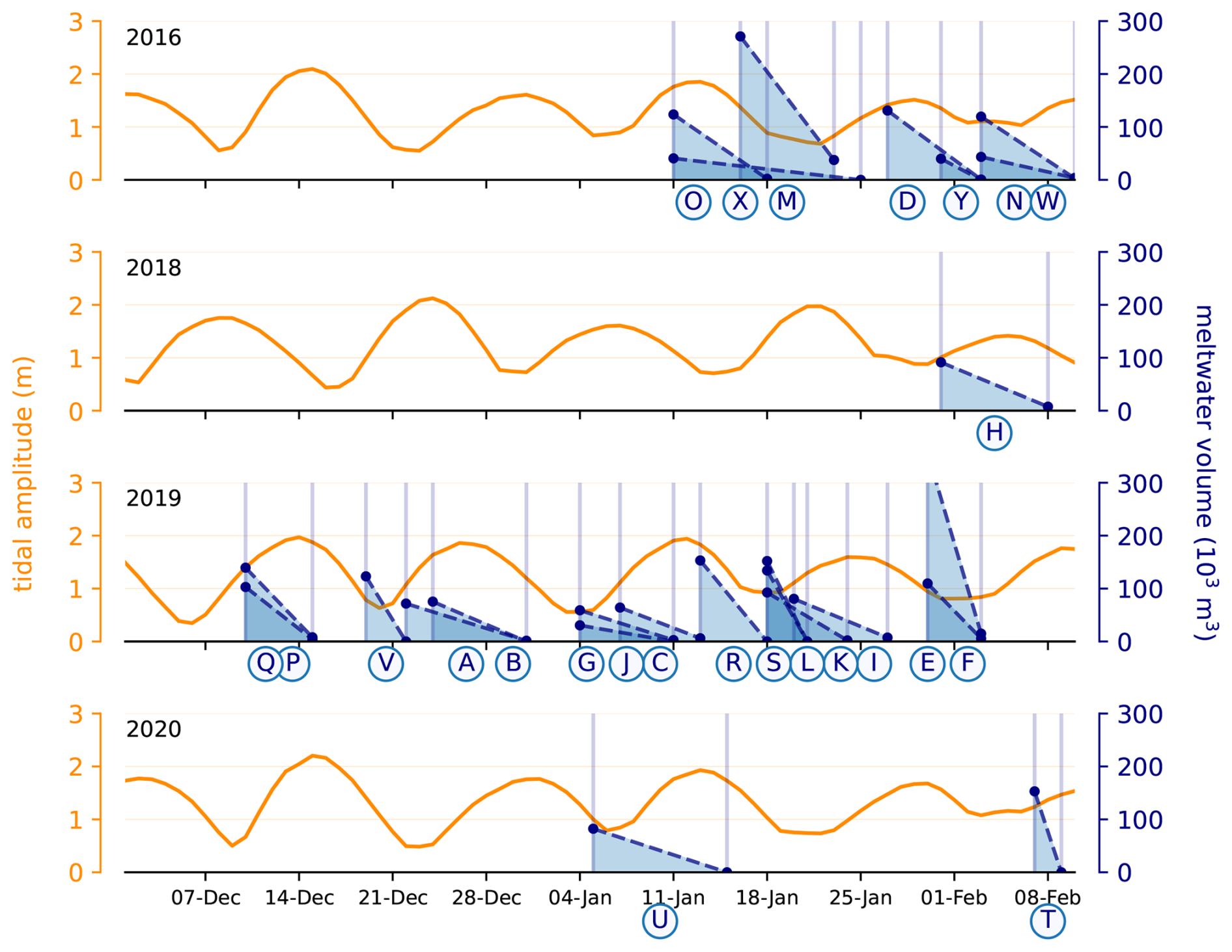 We compare the drainage time-windows to tidal data (Fig. 3), and indeed find a clear pattern: the majority of drainage episodes aligns with the ascending phase of tide cycles (17 out of 25). Although we cannot determine the exact drainage date, only a snapshot before and after the event, few drainages seem to have occurred on the descending phase.