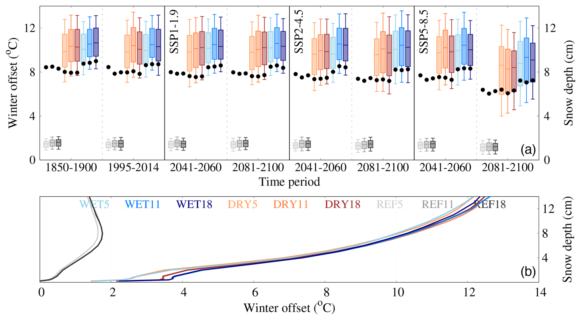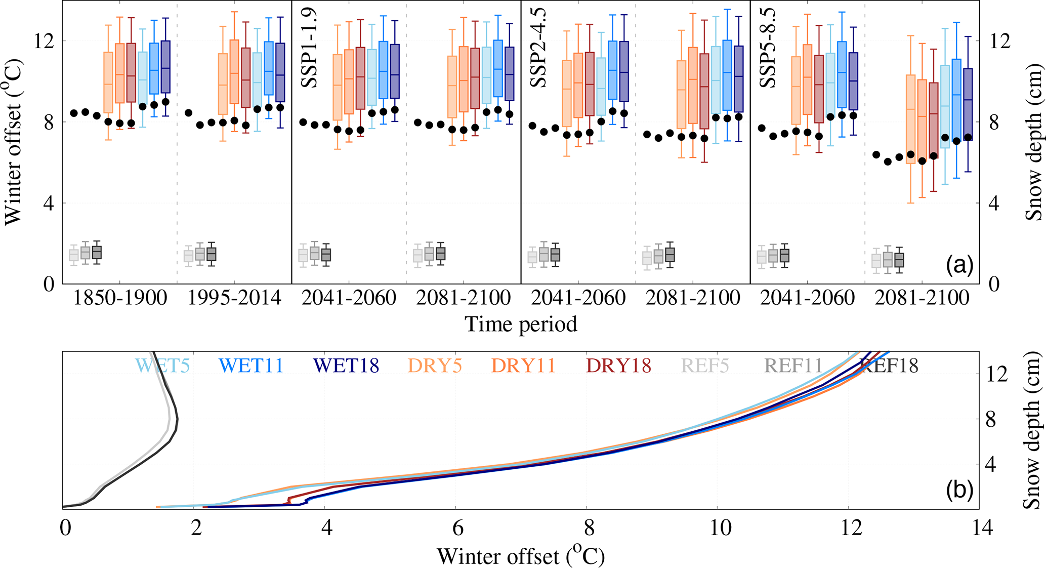 A considerable reduction in permafrost temperature variability, especially noticeable for MAGST and MAST 5 m (Fig. 4d, f), starts at the beginning of the 21st century for the SSP5-8.5 scenario. Interdecile ranges are reduced by a factor of 1.08–1.21 for 2041–2060, and 1.14–1.49 for 2081–2100 with respect to 1995–2014, depending on the MPIESM-PePE configuration. This reduction is likely produced by a decrease in spatial near-surface temperature heterogeneity associated with the retreat of the snow cover area in winter. Figure 5a explores this by showing the variability of the winter offset (see Sect. 2.3.1, boxplots) and snow depth (dots) in the permafrost domain for the same periods and scenarios as in Fig. 4. It can be seen that both snow cover and winter offset barely change in the historical, SSP1-1.9, and SSP2-4.5 periods, with very stable snow depth median values of 7.7 cm (REF), 7.2 cm (DRY), and 7.9 cm (WET). A small decrease of around 1 cm is shown for SSP5-8.5 by the late 21st century. Even though snow depth values are quite similar between the three MPIESM-PePE configurations, winter offset shows remarkable differences between the REF, and the WET and DRY experiments. The permafrost domain median winter offset reaches 10–10.5 °C for WET and DRY, but is 8–9 °C lower in REF. This contrast extends to the spatial variability: the interdecile range (box width in Fig. 5a) ranges from 6–8 °C in WET and DRY, but is only of about 1 °C for REF. Moreover, WET winter offset values are systematically about 0.5 °C higher than DRY, which is consistent with WET being colder (Fig. 4) and having more snow cover. For the three configurations, thinning snow depth leads to less winter offset, being of 9.1 °C for WET and 8.4 °C for DRY by the end of the SSP5-8.5 period.