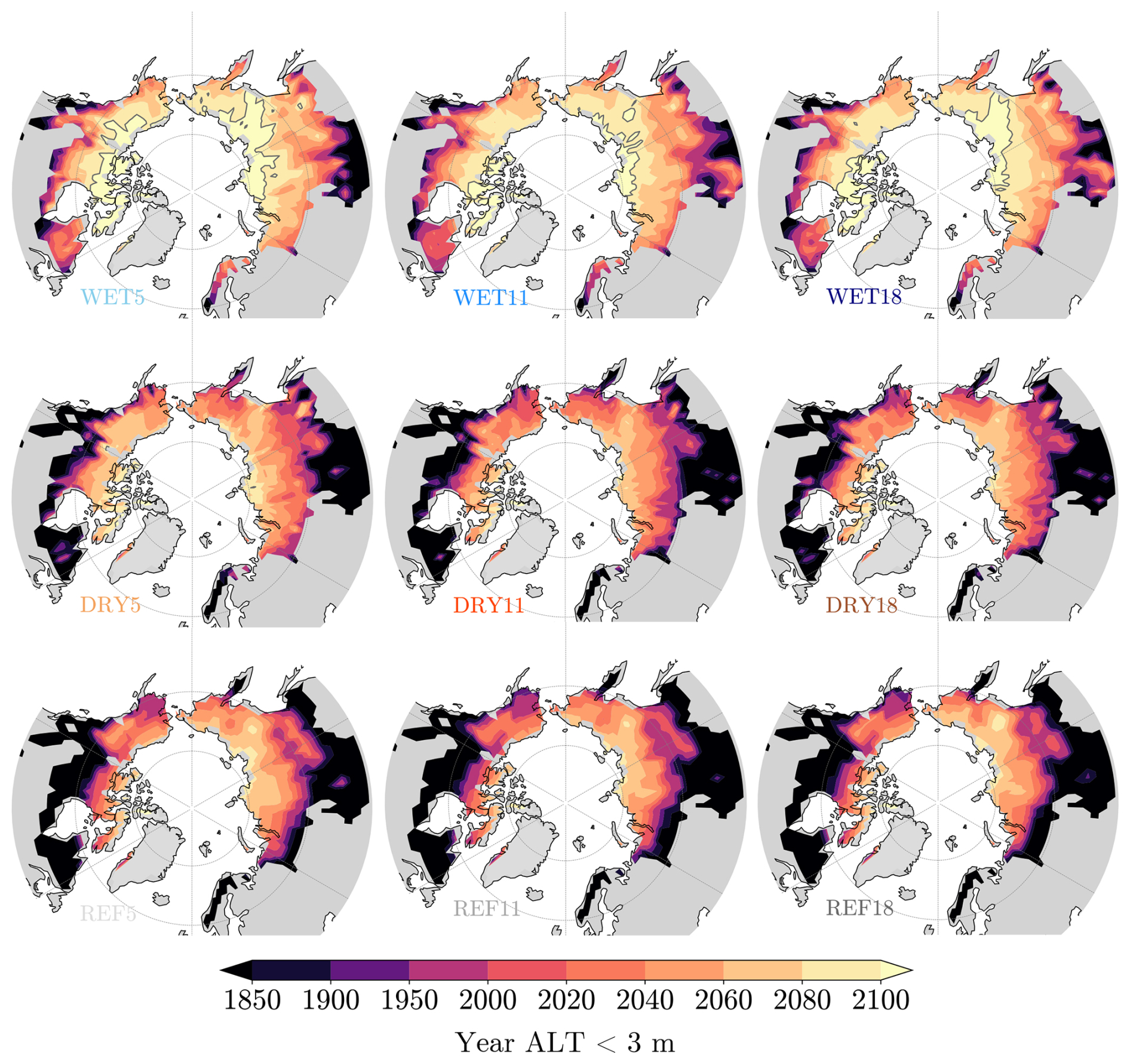 Figure 9Deep permafrost presence with time for the combination of the three hydrological configurations (WET, DRY, REF) and vertical discretizations (5L, 11L, 18L). This is represented by the spatial distribution of the last simulation year (HIS + SSP5-8.5) in which ALT is equal to the mid-layer depth of the bottom layer (ALT =zn) for each MPIESM-PePE simulation. For the 18L simulations, 11L JSBACH zn was taken in order to allow for comparison. Contour lines delimit areas where ALT do not reach zn within the temporal extent of the simulation. The colored distribution stands over the permafrost domain displayed in Fig. 2a.