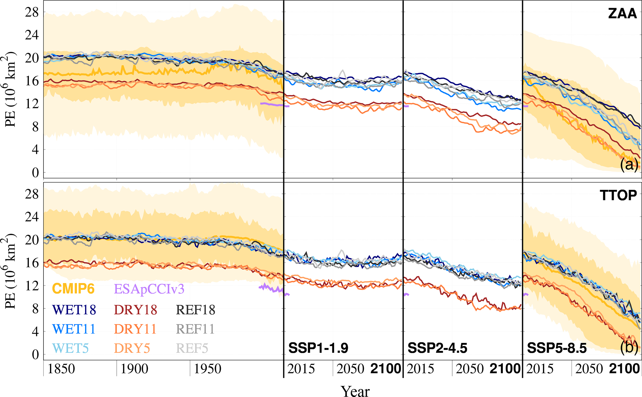 The time evolution of PE for the nine simulations of the MPIESM-PePE in the three SSP scenarios are compared with the PE values derived from the ESApCCIv3 and CMIP6 PE estimates provided by Steinert et al. (2023a) in Fig. 10. Both the MPIESM-PePE and the CMIP6 ensemble show a mostly constant permafrost area since 1850–1900 (see values in Table 3) until the last decades of the 20th century. WET and REF depict very similar early-historical PE values for both ZAA (Fig. 10a) and TTOP (Fig. 10b), in the range of 19.9–20.4 × 106 and 19.7–20.8 × 106 km2, respectively (Table 3). However, REF5 and REF11 ZAA, and REF11 TTOP estimates show more variability, with the periods of the largest PE values coinciding with the strongest volcanic cooling events in the historical period (e.g., an abrupt PE rise in the 1880s as a response to the Krakatoa eruption). In contrast, the DRY simulations depict an area around 5 × 106 km2 smaller than the REF and WET ones for both ZAA and TTOP (Table 3) and less temporal variability.