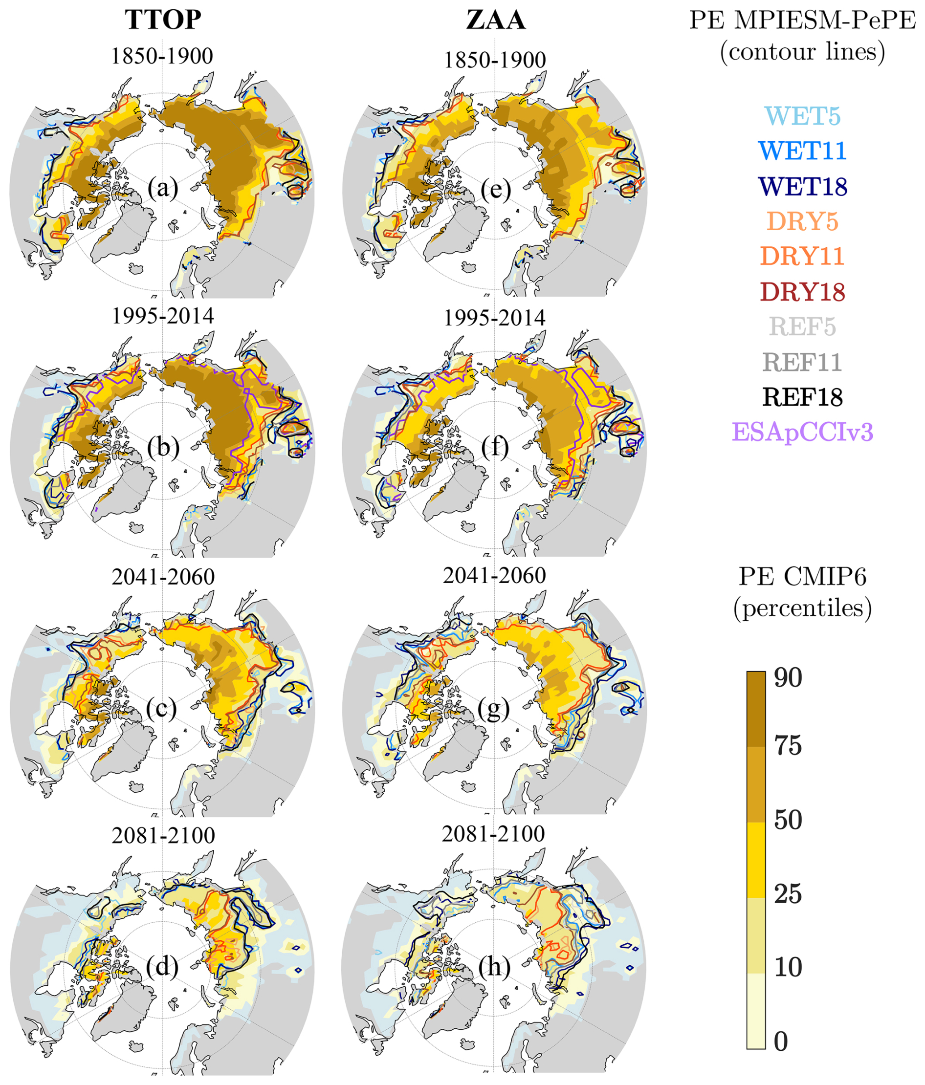 Figure 11Permafrost extent (PE) for different periods in the MPIESM-PePE and CMIP6 ensembles in the historical and SSP5-8.5 scenario, and observed historical extension. PE CMIP6 10th, 25th, 50th, 75th, and 90th percentiles spatial distribution (shading) for TTOP (a–d) and ZAA (e–h) for 1850–1900, 1995–2014, 2041–2060, and 2081–2100. The extent and distribution of PE for the different MPIESM-PePE experiments in the same periods are depicted with contour lines of different colors (see legend), whilst the observational ESApCCIv3 historical permafrost distribution in 1997–2019 is shown with a thicker purple contour line.